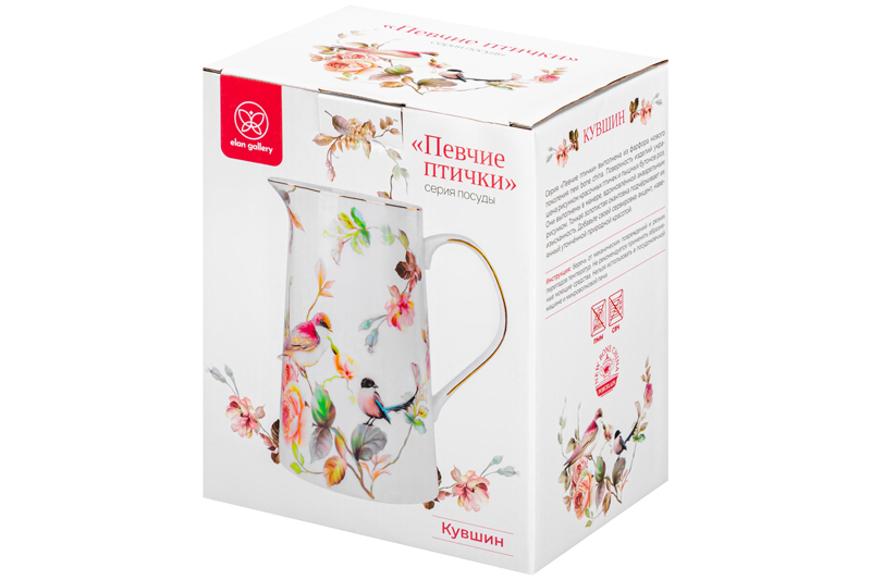 Кувшин из серии «Певчие птички» от Elan Gallery предназначен для эстетичной сервировки вашего стола. Размер изделия – 17,5х13х20,5 см, объём – 1,65 литра. Размер горлышка – 12х9,5 см. Выполнен из фарфора нового поколения new bone china, сочетающего в себе изящность и высокую прочность. Такие изделия легко отмываются, поэтому сохраняют привлекательный вид и практичны в использовании. Плотная структура материала позволяет посуде дольше сохранять температуру блюд и напитков. От других видов костяного фарфора new bone china отличается большей экологичностью в производстве. Изделие украшено рисунком пёстрых птичек и пышных бутонов роз. Они выполнены в манере, вдохновлённой акварельным рисунком. Тонкая золотистая окантовка служит деликатным акцентом и подчёркивает их изысканность. Наполненный соком или лимонадом, сосуд поможет организовать дружеские встречи и украсит ваш стол. Подойдёт для изящной подачи ваших любимых горячих и холодных напитков, например, глинтвейна или морса. Используйте его в качестве молочника – он станет идеальной альтернативой скучным пакетам молока. Заполните чистой питьевой водой или самодельным компотом, эстетично подавайте большие объёмы чая и кофе. Благодаря нежному дизайну изделие впишется в интерьер любой кухни, гостиной или столовой. Не рекомендуется применять абразивные моющие средства. Не использовать в микроволновой печи и посудомоечной машине. Поставляется в дизайнерской картонной коробке – благодаря ей вам не потребуется дополнительная подарочная упаковка. Фарфоровая сервировочная посуда будет оригинальным подарком для хозяйки, ценящей не только практичность, но и привлекательность. Серия «Певчие птички» от бренда Элан Галерея подарит вам ощущение мечтательной лёгкости!