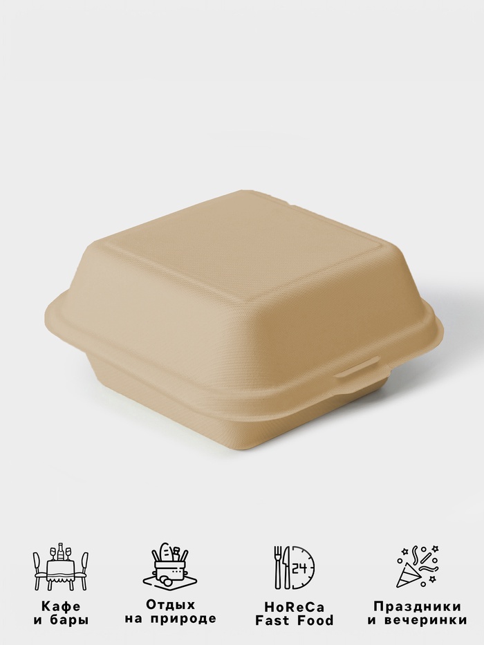Ланч - бокс, коробка для бенто-торта и бургера, 15.2×15.2×8 см, сахарный тростник, 50 шт./уп, бежевый