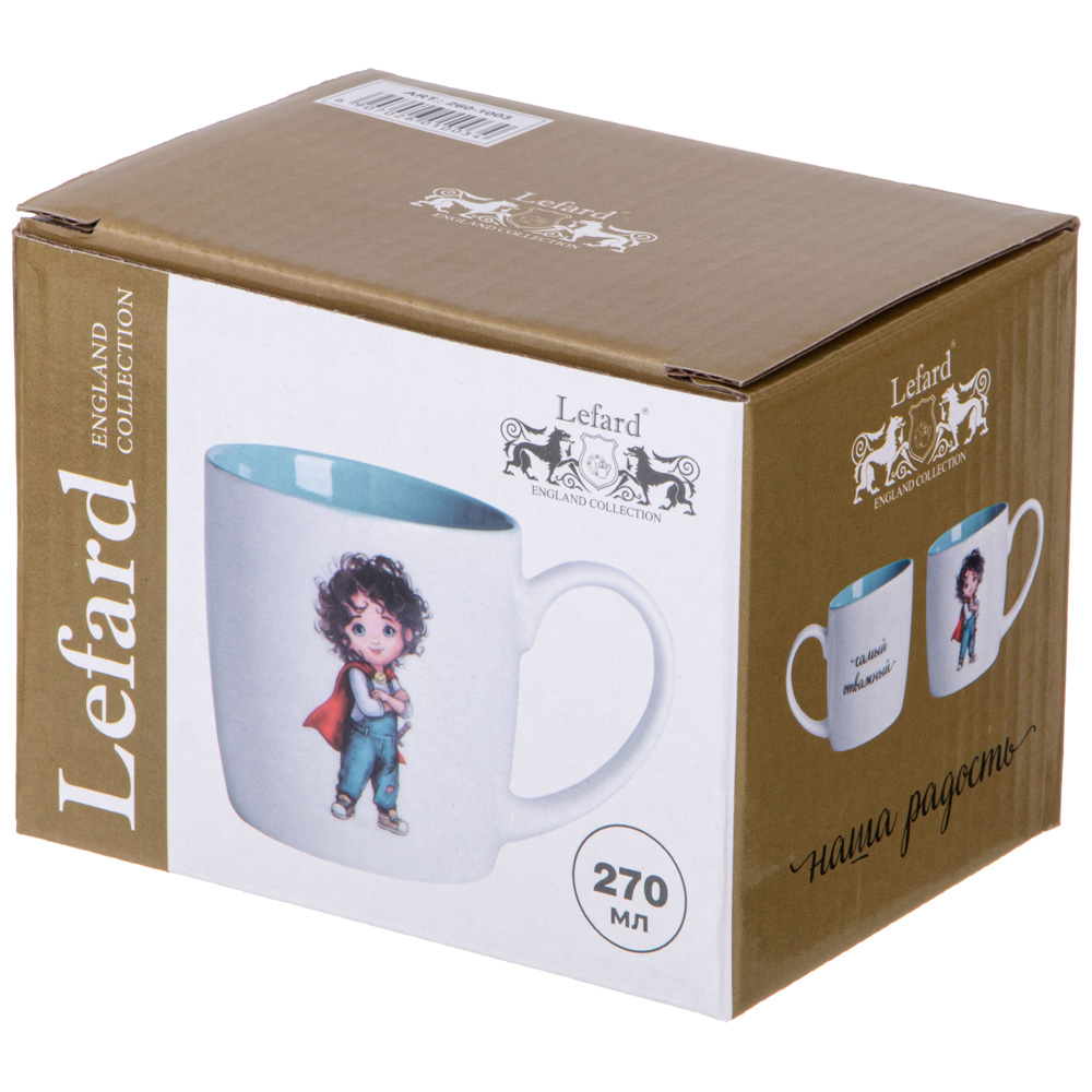 Кружка фарфоровая TM Lefard для чая "Самый отважный" 270 мл. Фарфоровая кружка для чая "Самый отважный" станет отличным дополнением к вашему столу и порадует как детей, так и взрослых. Она идеально подходит не только для чая, но и для кофе, горячего шоколада или других напитков. Эта кружка отличается ярким дизайном с изображением маленького мальчика. Посуда с такими декорами всегда вызывают улыбку у тех, кто их использует. Чашка детская имеет объем 270 мл, который идеально подходит для малышей. Прикольные подарки детям всегда радуют и оставляют приятные воспоминания. Подарочная упаковка делает ее подходящей для праздников и иных торжественных случаев. Данная красивая кружка является оригинальным вариантом на День Рождения или любой другой праздник. Посуда не только функциональна, но и эстетична. Кружка привлекает внимание своим качественным исполнением и продуманным дизайном. Это превосходный выбор в качестве подарочной продукции – она упакована так, что уже не требует дополнительной подготовки к вручению. Оригинальная чашка будет радовать ваших детей каждый день - она удобна, практична и надежна в использовании. Подарочные вещи всегда создают особенное настроение и подчеркивают внимание к деталям. Фарфоровое изделие устойчиво ко многим внешним воздействиям. Оно безопасно для здоровья ребенка благодаря использованию высококачественных материалов при производстве. Безопасность данного товара подтверждена необходимыми стандартами качества и соответствия нормам производства посуды для детей. Это отличный вариант на праздник как часть комплекта или самостоятельный подарок любимому малышу. Оригинальные изделия такого рода способствуют развитию вкуса у детей с раннего возраста.