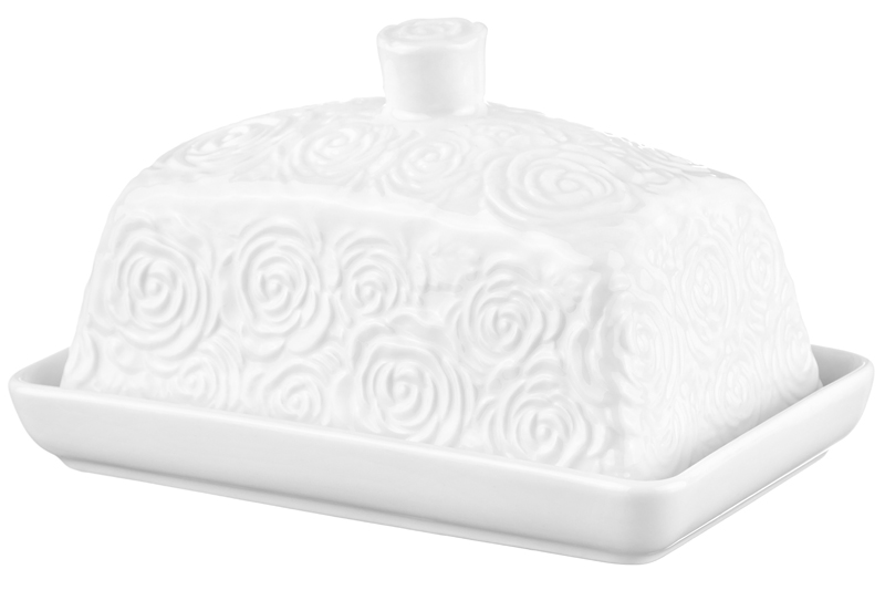 Маслёнка из серии «Розы» от Elan Gallery предназначена для хранения сливочного масла и других продуктов. Размер изделия – 13,5х9х8 см, высота без крышки – 1,5 см. Представляет собой фигурное блюдце и крышку-купол с удобной ручкой. Выполнена из высококачественного белого фарфора. Он не впитывает цвет продуктов и легко отмывается, благодаря чему надолго сохраняет свою белизну. Поверхность изделия украшают рельефные узоры в виде пышных бутонов роз. Используйте её для сервировки масла, сыра и лимонов, а также для хранения этих продуктов в холодильнике. Ёмкость послужит в качестве небольшой конфетницы для разнообразных сладостей: зефира, безе, леденцов или мармелада. Необычная крышка придаст эффектность любой подаче. Такое изделие стильно дополнит сытный завтрак и уютное чаепитие. Не рекомендуется применять абразивные моющие средства. Подходит для использования в посудомоечной машине и микроволновой печи. Поставляется в дизайнерской картонной коробке – благодаря ей вам не потребуется дополнительная подарочная упаковка. Фарфоровая сервировочная посуда будет оригинальным подарком для хозяйки, ценящей не только практичность, но и привлекательность. Серия «Розы» от бренда Элан Галерея станет украшением любого кухонного инвентаря и позволит собрать красивый сервиз в едином стиле! /