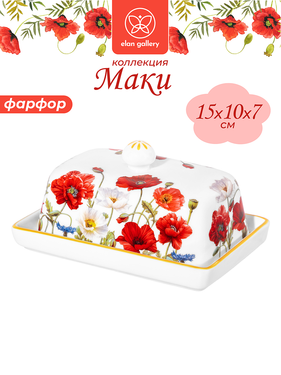 Маслёнка из серии «Маки» от Elan Gallery предназначена для хранения и сервировки сливочного масла. Размер изделия – 15,5х10,5х7,8 см. Внутренний размер под крышкой – 13х8 см, высота блюда без крышки – 2 см. Выполнена из фарфора нового поколения new bone china, сочетающего в себе изящность и высокую прочность. За счёт гладкости изделия легко отмываются, поэтому сохраняют привлекательный внешний вид и практичны в использовании. Плотная структура материала позволяет посуде дольше сохранять температуру блюд и напитков. От других видов костяного фарфора new bone china отличается большей экологичностью в производстве. Белая поверхность украшена красочным принтом с крупными цветами. Изображение красных и белых маков на фарфоре добавит ярких красок любой кухне. Используйте маслёнку для подачи масла, сыра и лимонов, а также хранения этих продуктов в холодильнике. Ёмкость выступит в качестве небольшой конфетницы для разнообразных сладостей: зефира, безе, леденцов и мармелада. Крышка с удобной ручкой придаст эффектность любой подаче, а благодаря красивому рисунку на блюдце вы можете использовать его отдельно. Не рекомендуется применять абразивные моющие средства. Подходит для использования в посудомоечной машине и микроволновой печи. Поставляется в дизайнерской картонной коробке – благодаря ей вам не потребуется дополнительная подарочная упаковка. Серия «Маки» от бренда Элан Галерея станет украшением любого кухонного инвентаря и позволит собрать красивый сервиз в едином стиле!