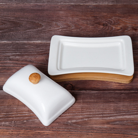 Керамическая масленка с крышкой на деревянной подставке.