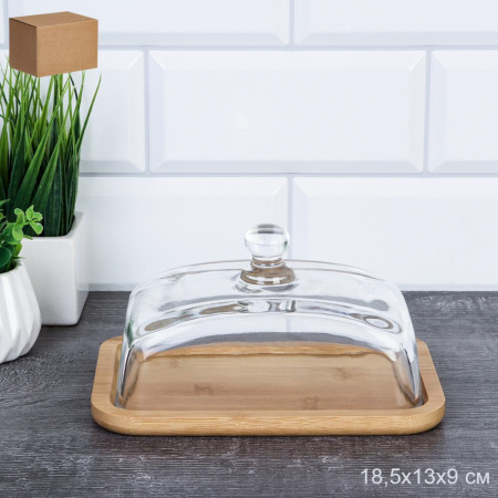 Стеклянная масленка с крышкой на деревянной подставке.