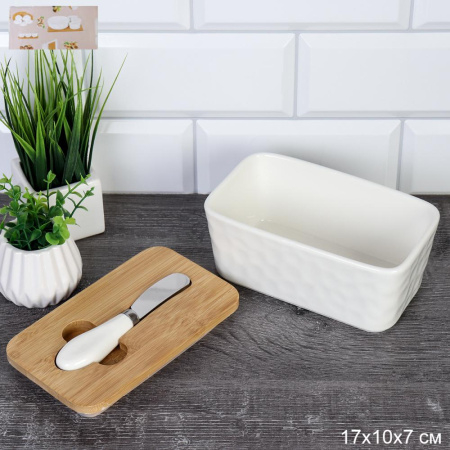 Керамическая масленка с ножом 13 см и крышкой на деревянной подставке.