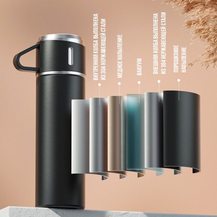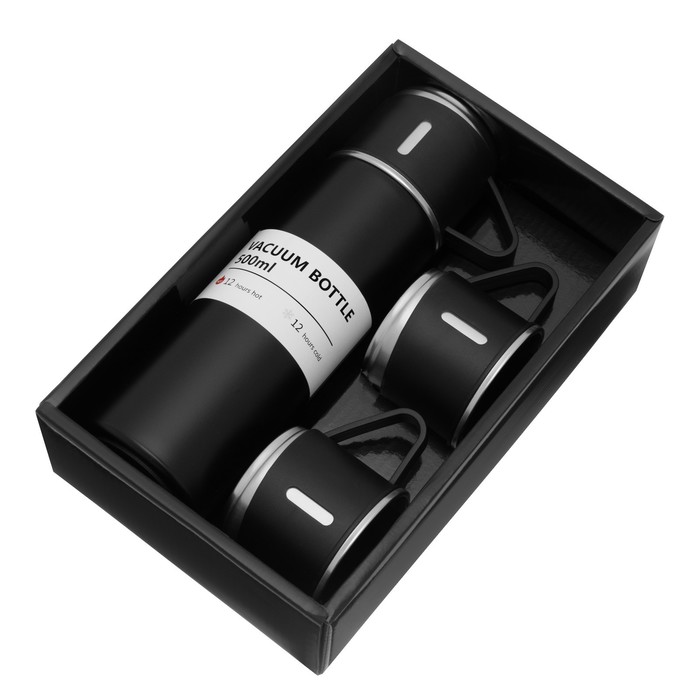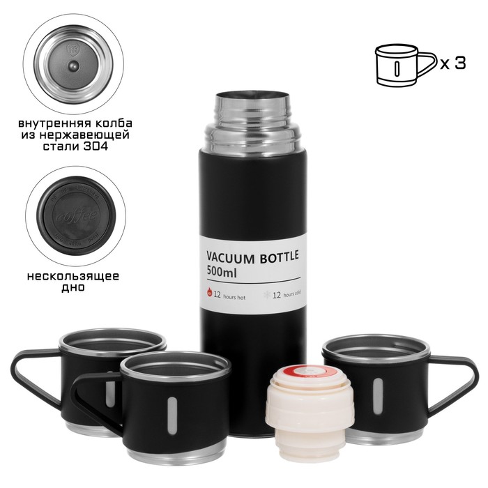 Набор «Мастер К», термос 500 мл и 3 кружки 160 мл, сохраняет тепло 12 ч, нержавеющая сталь, чёрный