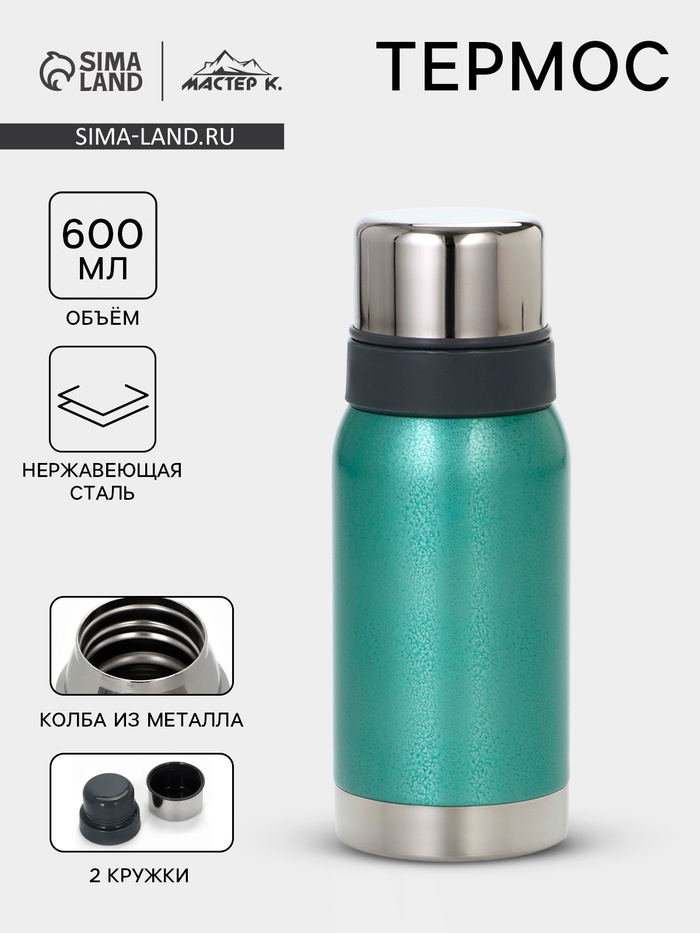 Термос Мастер К, 600 мл, 2 крышки-кружки, нержавеющая сталь, бирюзовый