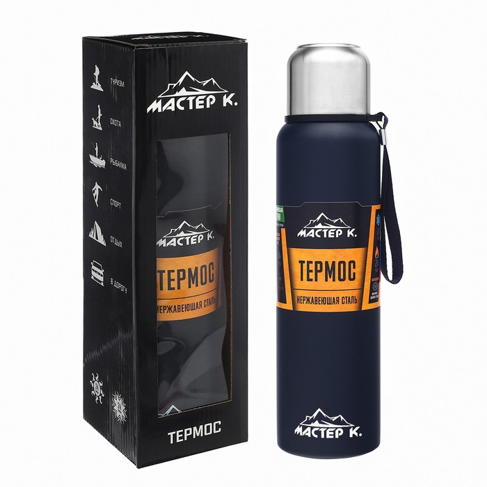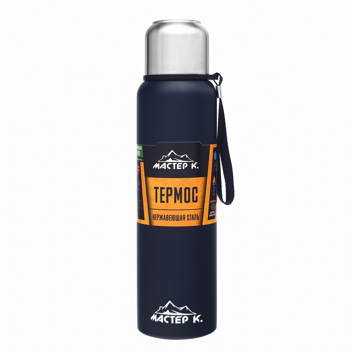 Термос Мастер К «Путешествие», 1 л, с кружкой, сохраняет тепло 24 ч, с ситечком, нержавеющая сталь, синий