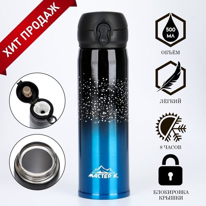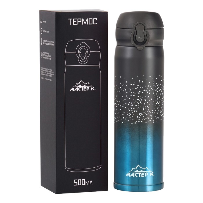 Компактный, экологичный, стильный. Термосы этой серии пользуются большой популярностью у активных и динамичных пользователей, а так же у любителей охоты и рыбалки, так как они, сохраняют прочность и термоустойчивость, легки и компактны. Этот термос просто идеально подойдет для тех, кто ценит свое время и хочет наслаждаться свежим и горячим кофе, чаем или другими любимыми напитками в любой ситуации. Термос "Мастер К" 500 мл (0.5 л) это яркое решение для любителей чая, кофе, травяных, ягодных и фруктовых заварок. Летом данный термос станет приятным спутником на пляж и в жаркий день, так как он сохраняет напиток холодным.