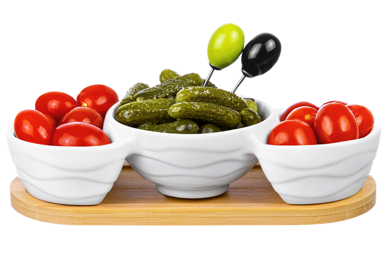 Менажница из серии «Айсберг волны» от Elan Gallery предназначена для эстетичной сервировки вашего стола. Размер изделия – 22х9,5х5,8 см. Объём маленьких секций – 70 мл каждая, объём большой секции – 150 мл. Выполнена из высококачественного белого фарфора. Он не впитывает цвет продуктов и легко отмывается, благодаря чему надолго сохраняет свою белизну. Поверхность изделия украшают рельефные узоры в виде поперечных волн. Подставка выполнена из бамбука, шпажки выполнены из металла. Менажница поможет красиво подавать маслины, орехи или сыры. Она станет незаменимым элементом праздничных обедов или неторопливых завтраков. Послужит в качестве конфетницы, позволив угостить себя и гостей любимыми сладостями: конфетами, мармеладом, леденцами или безе. Металлические шпажки помогут вам взять угощение. Без бамбуковой подставки и шпажек подходит для использования в посудомоечной машине и микроволновой печи. Бамбук нельзя замачивать! Поставляются в дизайнерской картонной коробке – благодаря ей вам не потребуется дополнительная подарочная упаковка. Фарфоровая сервировочная посуда будет оригинальным подарком для хозяйки, ценящей не только практичность, но и привлекательность. Серия «Айсберг волны» от бренда Элан Галерея станет украшением любого кухонного инвентаря и позволит собрать красивый сервиз в едином стиле! /