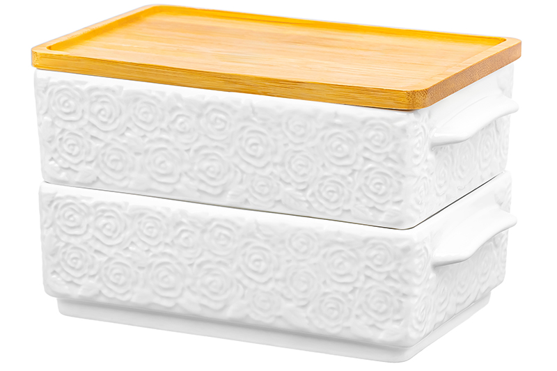 Набор 2 блюд для холодца из серии «Розы» от Elan Gallery предназначен для приготовления и эстетичной подачи ваших любимых блюд. Размер каждого изделия – 20,5х12х6 см, объём – 800 мл, внутренний размер – 17х11 см. Выполнены из высококачественного фарфора. Он не впитывает цвет продуктов и легко отмывается, благодаря чему надолго сохраняет свою белизну. Поверхность изделий украшают рельефные узоры в виде пышных бутонов роз. Крышка выполнена из натурального бамбука. Вместительные контейнеры подойдут для сельди под шубой, салатов и плова, и помогут порадовать себя или гостей за праздничным столом. Используйте их в качестве салатников или глубоких сервировочных блюд для эстетичной подачи закусок из мяса и рыбы. Такая посуда удобна для приготовления заливного или желе, а также бисквита или творожной запеканки. Заполните каждое блюдо щедрой порцией мороженного, чтобы угостить большую компанию. Компактно храните штабелируемые блюда друг на друге. Лаконичный дизайн впишет их в интерьер любой кухни, гостиной или столовой. Не рекомендуется применять абразивные моющие средства. Без крышки подойдут для использования в посудомоечной машине, микроволновой печи и духовом шкафу при температуре до 230 градусов. Бамбук нельзя замачивать! Поставляются в дизайнерской картонной коробке – благодаря ей вам не потребуется дополнительная подарочная упаковка. Фарфоровая сервировочная посуда будет оригинальным подарком для хозяйки, ценящей не только практичность, но и привлекательность. Серия «Розы» от бренда Элан Галерея станет украшением любого кухонного инвентаря и позволит собрать красивый сервиз в едином стиле! /