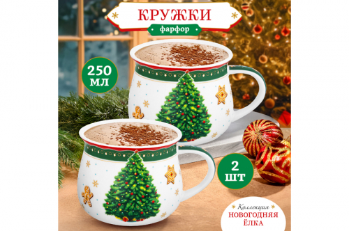 Набор 2 кружек 250 мл 11*8,5*7 см "Новогодняя елка", красный узор, бочонок NEW BONE CHINA