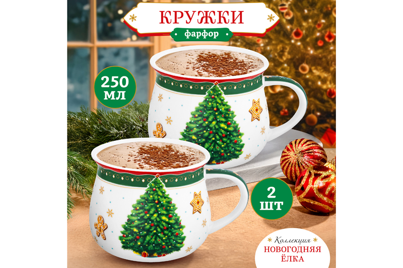 Набор 2 кружек 250 мл 11*8,5*7 см "Новогодняя елка" зеленый узор, бочонок NEW BONE CHINA