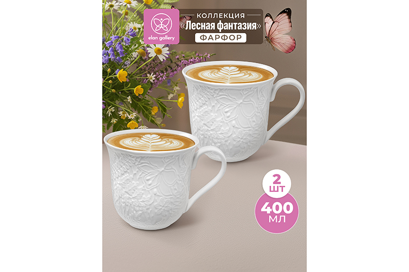 Набор 2 кружек от бренда Elan Gallery "Лесная фантазия" выполнен из белого фарфора. Размер каждого фарфорового изделия 13,5х10,5х9,5 см, объём – 400 мл. Коллекция посуды "Лесная фантазия" украшена изящным рельефным узором в виде цветов и порхающих бабочек. Она навевает фантазии о лесной поляне — благоухающей и согретой лучами солнца. Кружечки с изящным рельефом помогут провести множество приятных завтраков с капучино или латте, а также уютных чайных вечеров с любимым горячим напитком. Белые бокалы подходят ценителям чая и кофе, которые любят пить из красивой посуды. Фарфоровое изделие отлично подойдёт как для молока, так свежевыжатого сока и морса. Фарфор в отличие от керамики быстро отмываются и не впитывает цвет напитков. Кружки украсят интерьер вашей кухни, столовой и привнесут эстетики в повседневные моменты. Подойдут для кофейных перерывов на работе в офисе. Можно использовать как парные. Не рекомендуется применять абразивные моющие средства. Беречь от резких перепадов температур и механических повреждений. Подходят для посудомоечной машины и микроволновой печи. Комплект поставляется в стильной картонной коробке. Вам не придётся искать дополнительную подарочную упаковку, чтобы сделать сюрприз близким на праздник. Праздничная посуда – хороший вариант для подарка. В коллекции бренда Элан Галерея можно найти много красивого кухонного и столового инвентаря, а также собрать чайный набор на свой вкус. Коллекция "Лесная фантазия" от Elan Gallery наполнит повседневные моменты лёгкостью и сказочной атмосферой, а также позволит создать красивую сервировку праздничного стола!