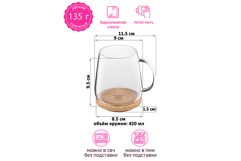 Набор из 2-х кружек Crystal glass по 420 мл поможет провести множество уютных чаепитий или приятных завтраков с любимым кофе. Имеют в комплекте пробковые крышки, которые можно использовать как подставки. Набор выполнен из термостойкого боросиликатного стекла. Стильные чашки смогут стать чайным или кофейным набором на 2 персоны. Подходят как для холодных, так и горячих напитков: воды, лимонада, коктейлей, чая, эспрессо, капучино, латте, глинтвейна. Напитки в прозрачных кружках выглядят яркими и красивыми. Набор поможет организовать эстетичную сервировку стола. Без подставок стеклянные жаропрочные кружки подходят для использования в СВЧ (микроволновой печи) и ПММ (посудомоечной машине). Комплект поставляется в стильной картонной упаковке. Необычные кружки из серии посуды Crystal glass смогут стать настоящим украшением кухни и дома или приятным подарком для ваших родных и близких.