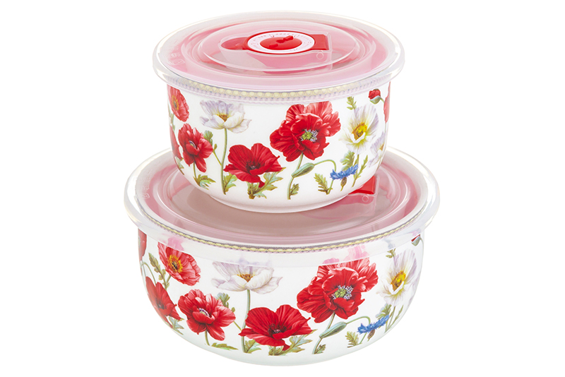Набор Elan Gallery из серии "Маки" состоит из 2 салатников с пластиковыми крышками разного объема: 560 мл и 260 мл. Контейнеры подойдут для сервировки, транспортировки и помогут компактно хранить продукты. Размеры кухонных ёмкостей 13х13х6,5 см и 10,5х10,5х6 см. Пустые чаши можно компактно хранить друг в друге. Комплект выполнен из высококачественного фарфора new bone china. New bone china сочетает в себе изящность и высокую прочность. От других видов костяного фарфора материал отличается большей экологичностью в производстве. Крышки на глубоких блюдах выполнены из пищевого пластика полипропилена и имеют силиконовые уплотнители. Пищевой пластик не выделяет вредных веществ и безопасен для здоровья. Фарфоровые миски имеют на крышечках клапаны для контроля воздуха внутри и календарные индикаторы. Можно отслеживать, сколько дней хранится пища в салатниках. Серия "Маки" украшена красочным принтом с крупными цветами. Изображение красных и белых маков на фарфоре добавит ярких красок вашей кухне. Универсальный инвентарь подходит для хранения в холодильнике и транспортировки готовых блюд. Благодаря красочному дизайну подходит для подачи салатов на стол. За счёт глубокой формы миски удобны для смешивания ингредиентов. Можно использовать для различной еды на даче и пикнике. Не рекомендуется применять абразивные моющие средства. С открытым клапаном на крышке можно разогревать в микроволновой печи. Можно мыть в посудомоечной машине. Набор поставляется в яркой картонной упаковке. Салатники из серии посуды "Маки" станут украшением вашей кухни или приятным подарком на любой праздник. Благодаря стильной коробочке не понадобится подарочная упаковка. В коллекции бренда Elan Gallery можно найти сервировочные блюда, тарелки и ёмкости для хранения на любой вкус. Ознакомьтесь со всем ассортиментом товаров для дома. /