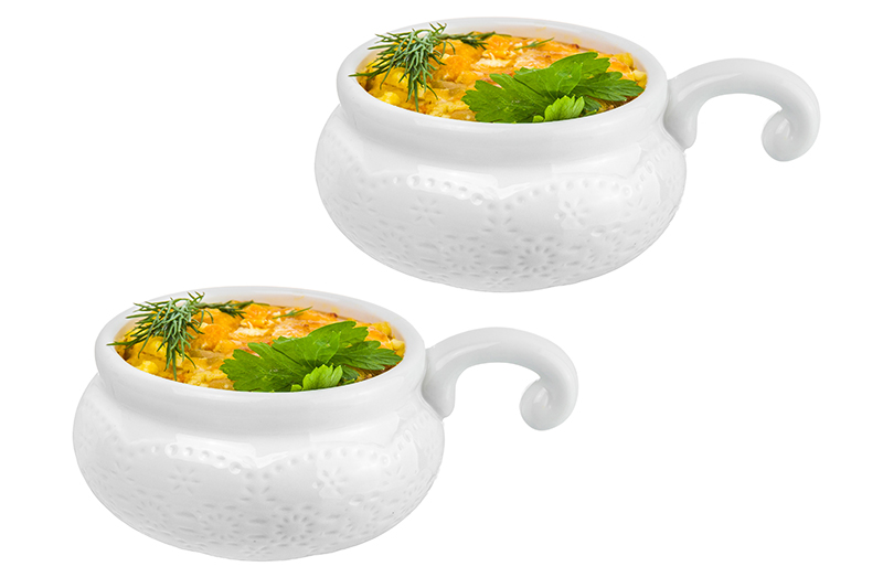 Набор 2 жюльенниц-кокотниц из серии «Кружево» от Elan Gallery предназначен для приготовления и сервировки горячих блюд. Размер каждой ёмкости – 14х10,5х5,5 см, объём – 270 мл. Выполнены из высококачественного белого фарфора. Он не впитывает цвет продуктов и легко отмывается, благодаря чему надолго сохраняет свою белизну. Поверхность украшена рельефным кружевным узором. Красивые формочки можно использовать для приготовления разнообразных кондитерских и кулинарных изделий: классического жульена или десертов. Удобные ручки позволят подавать блюда к столу сразу после приготовления. Послужат в качестве маленьких суповых тарелочек для подачи бульонов, разнообразных супов и крем-супов. Запеките в духовке крем-брюле, запеканку или шоколадный фондан. Не рекомендуется применять абразивные моющие средства. Подходят для использования в посудомоечной машине, микроволновой печи и духовом шкафу при температуре до 230 градусов. Поставляются в дизайнерской картонной коробке – благодаря ей вам не потребуется дополнительная подарочная упаковка. Фарфоровая сервировочная посуда будет оригинальным подарком для хозяйки, ценящей не только практичность, но и привлекательность. Серия «Кружево» от бренда Элан Галерея станет украшением любого кухонного инвентаря и позволит собрать красивый сервиз в едином стиле! /