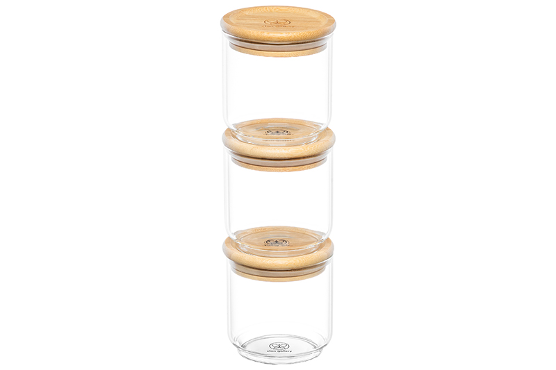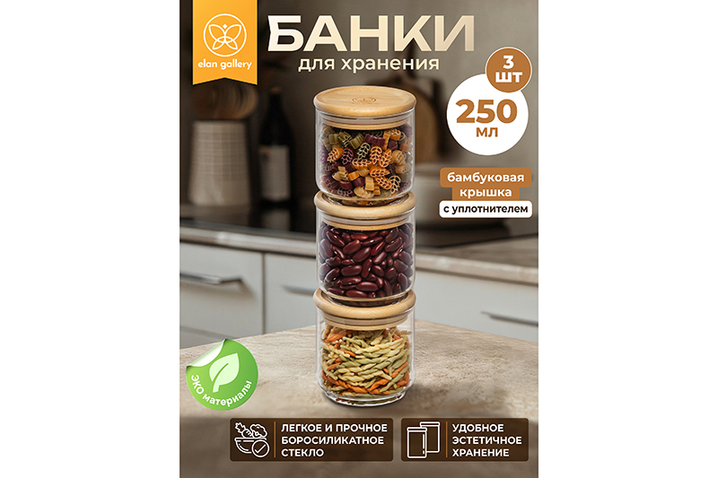 Набор 3 банок из серии Crystal glass поможет организовать хранение продуктов на вашей кухне. Размер каждого изделия – 8х8х8,5 см, объём – 250 мл. Выполнены из жаростойкого стекла, крышки выполнены из бамбука. Ёмкости станут незаменимым элементом кухонного инвентаря. Используйте штабелируемые баночки для удобного и компактного хранения сыпучих продуктов: чая, кофе, сахара, соли, приправ, специй и круп. Они также идеально подойдут для сладостей и небольших закусок – конфет, орехов, ягод и сухофруктов. Деревянные крышки с силиконовыми уплотнителями обеспечивают герметичное закрытие, сохраняя свежесть и аромат содержимого. Углублённая форма крышечек позволяет ставить банки друг на друга, что экономит место на кухне и помогает поддерживать порядок. Стильный и практичный дизайн делает эти баночки идеальным решением для организации пространства! Не рекомендуется применять абразивные моющие средства. Без бамбуковых крышек подходят для использования в посудомоечной машине и микроволновой печи. Изделие поставляется в стильной картонной коробке – благодаря ей вам не потребуется дополнительная подарочная упаковка. Оно станет отличным подарком для хозяйки, ценящей функциональный и стильный кухонный инвентарь!