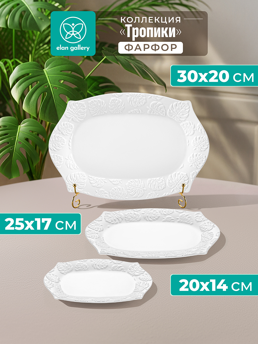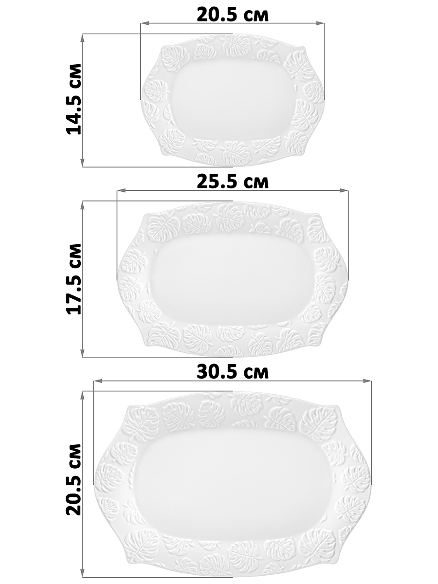 Набор 3 сервировочных фигурных блюд от бренда Elan Gallery "Тропики" выполнен из белого фарфора. В комплект входят тарелки размерами 20,5х14,5х2, 25,5х17,5х2, 30,5х20,5х2,5 см. По краям фарфоровые изделия украшены рельефным узором с тропическими листьями. Благодаря необычной форме тарелочки позволят создать оригинальную сервировку любых закусок, особенно интересно будут выглядеть на них суши и роллы. Выложите на блюда мясную, сырную и рыбную нарезку. Добавьте сочных овощей и свежей зелени, чтобы создать аппетитную композицию. Разнообразие размеров изделий в комплекте от большого до маленького позволит подобрать нужный вариант под определённое угощение. Положите на тарелочки сыр, колбасу и кусочки овощей и фруктов, чтобы порадовать гостей на празднике или вечеринке. Можно использовать как сервировочные подставки для подачи кексов и любой выпечки и десертов. Возьмите с собой на дачу, чтобы сервировать на тарелке кусочки шашлыка со свежей зеленью и соленьями. Не рекомендуется применять абразивные моющие средства. Избегать резких перепадов температур и механических повреждений. Можно использовать в микроволновой печи и мыть в посудомоечной машине. Декоративные блюда поставляются в стильной картонной коробке с логотипом бренда. Благодаря ей вам не понадобится дополнительная подарочная упаковка. Комплект станет приятным подарком для тех, кто ценит стильную и эстетичную сервировку. Подарите красивый кухонный инвентарь своим близким на любой праздник. Набор от Elan Gallery "Тропики" добавит вашей сервировке природного очарования в самой изящной форме и позволит собрать сервиз в едином стиле.