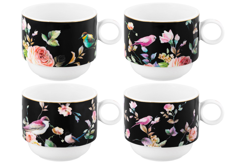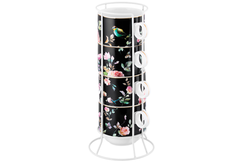 Набор 4 кружек 300 мл 12*9*8 см "Певчие птички на черном" на металлической подставке, NEW BONE CHINA