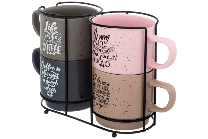 Набор 4 кружек 380 мл 13,5*9*9 см "Кофе" на металлической подставке