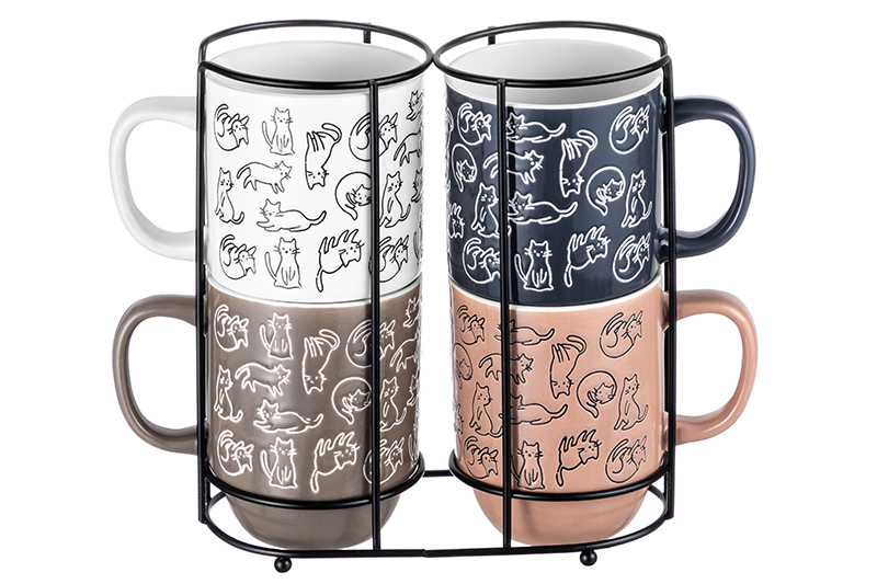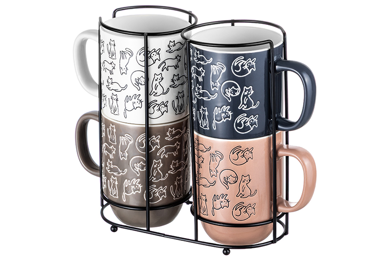 Набор 4 кружек 400 мл 12*8,5*11см "Кошачья жизнь" на металлической подставке
