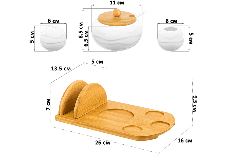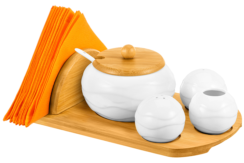 Набор посуды от Elan Gallery из серии «Айсберг волны» на бамбуковой подставке предназначен для эстетичной сервировки вашего стола. Включает в себя сахарницу с ложкой, набор для специй, вазочку под зубочистки и бамбуковую подставку с отсеком для салфеток. Набор выполнен из белого фарфора с бамбуковыми элементами. Размер сахарницы – 11х11х8,5 см, объём – 310 мл. Размер каждой маленькой ёмкости – 6х6х5 см, объём – 75 мл. Зубочистки не входят в комплект. Размер встроенной в подставку салфетницы 13,5х5х7 см. Фарфоровые изделия не впитывают цвет продуктов и легко отмывается, благодаря чему надолго сохраняет свою белизну. Поверхность изделий украшают рельефные узоры. Подставка и крышка сахарницы выполнены из натурального бамбука. Подайте комплект на стол вместе с горячими блюдами, чтобы каждый мог приправить пищу по своему вкусу. Эстетичную ёмкость можно приспособить под варенье, мёд или икру. Маленькая ложечка позволит удобно набрать необходимое количество продуктов. Она компактно помещается в баночке благодаря выемке на крышке. Такое изделие отлично дополнит сервировку стола как для сытного завтрака, так и для уютного чаепития. Набор для специй позволит держать под рукой соль и необходимые приправы. Баночки наполняются через отверстие снизу и закрываются пластиковой пробкой. Вазочка для зубочисток станет удобной гигиенической принадлежностью. Не рекомендуется применять абразивные моющие средства. Без бамбуковых элементов ёмкости подходят для использования в микроволновой печи и посудомоечной машине. Поставляются в дизайнерской картонной коробке – благодаря ей вам не потребуется дополнительная подарочная упаковка. Фарфоровая сервировочная посуда будет оригинальным подарком для хозяйки, ценящей не только практичность, но и привлекательность. Серия «Айсберг волны» от бренда Элан Галерея пополнит вашу коллекцию кухонного инвентаря и позволит собрать красивый сервиз в едином стиле!