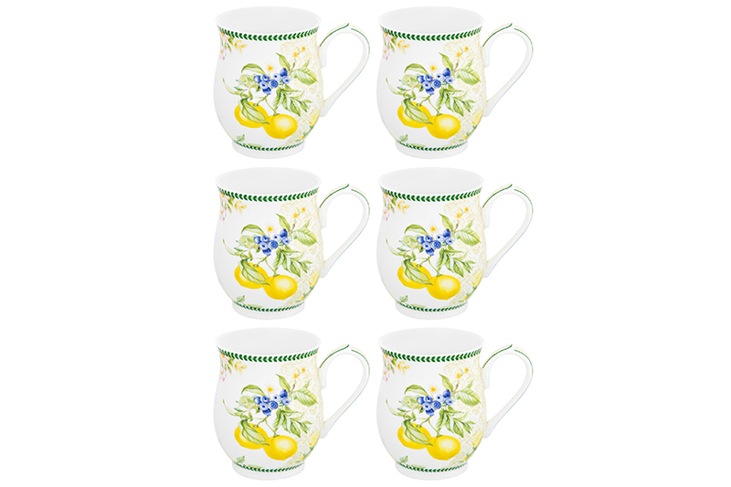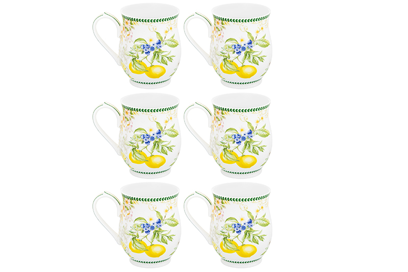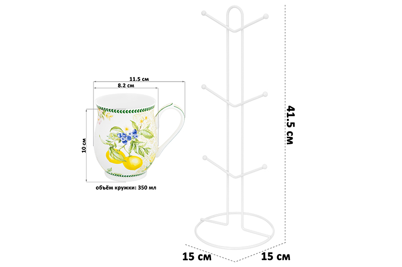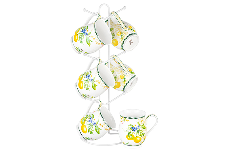 Набор серии "Лимоны" состоит из 6-ти кружек по 350 мл на металлической подставке 15х15х41,5 см. Набор кружек поможет провести множество приятных завтраков с капучино или латте, а также уютных чайных вечеров. Кружки выполнены из высококачественного белого фарфора и украшены декоративными изображениями. Фарфоровые чашки отличаются от керамических повышенной плотностью. Они не впитывают цвет кофе, чая, глинтвейна, других горячих напитков и не деформируются от влаги, чему может быть подвержена керамика. Кружки можно использовать в СВЧ и ПММ. Комплект поставляется в стильных картонных упаковках. Красивые кружки из серии посуды "Лимоны" смогут стать настоящим украшением кухни у вас дома или приятным подарком для ваших родных и близких!