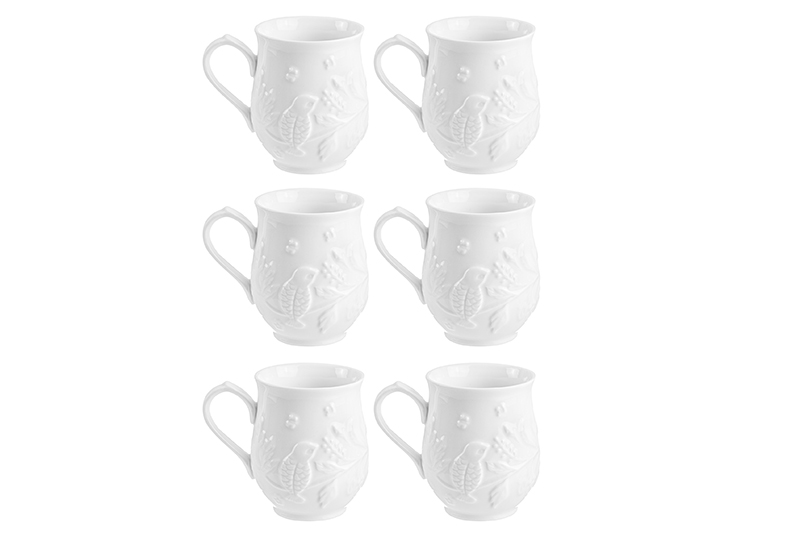 Набор серии "Птички на ветке" состоит из 6-ти кружек по 350 мл на металлической подставке 15х15х41,5 см. Набор кружек поможет провести множество приятных завтраков с капучино или латте, а также уютных чайных вечеров. Кружки выполнены из высококачественного белого фарфора и украшены декоративными рельефными узорами. Фарфоровые чашки отличаются от керамических повышенной плотностью. Они не впитывают цвет кофе, чая, глинтвейна, других горячих напитков и не деформируются от влаги, чему может быть подвержена керамика. Кружки можно использовать в СВЧ и ПММ. Комплект поставляется в стильных картонных упаковках. Красивые кружки из серии посуды "Птички на ветке" смогут стать настоящим украшением кухни у вас дома или приятным подарком для ваших родных и близких!