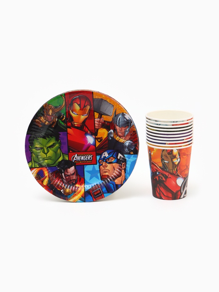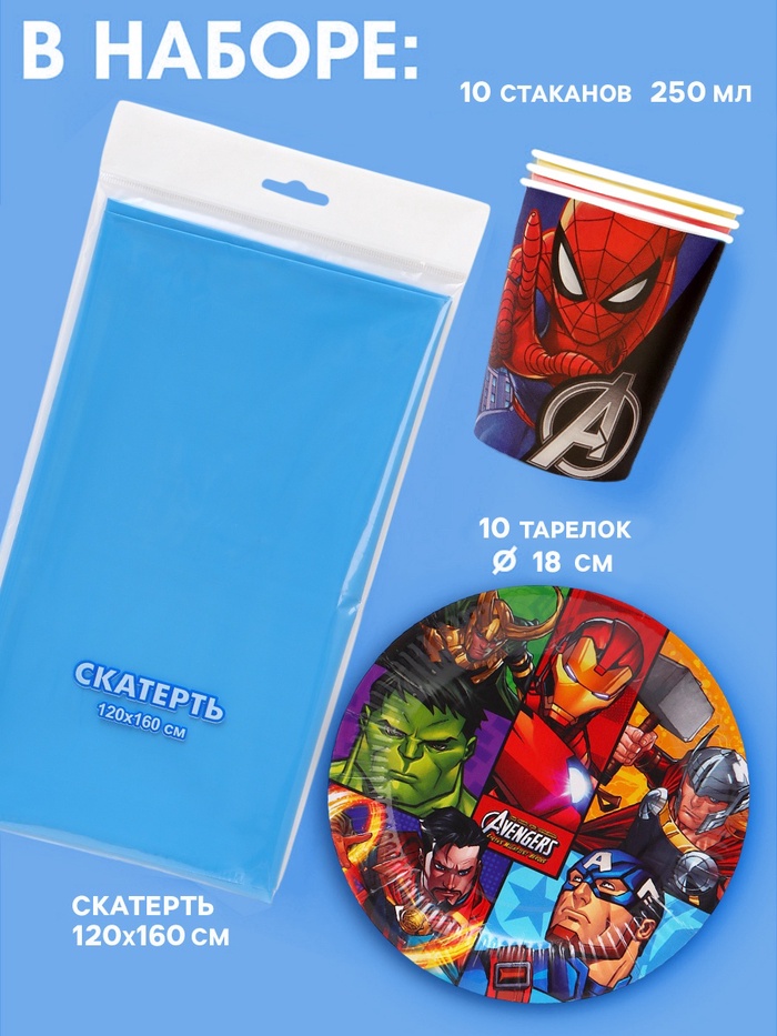 Набор бумажной посуды 10 персон: стакан, тарелка, скатерть, Мстители