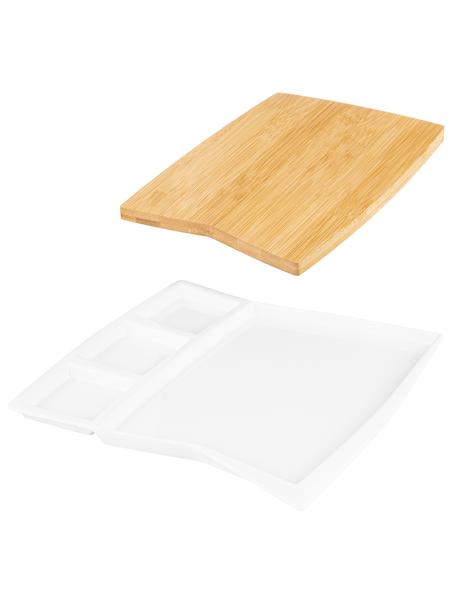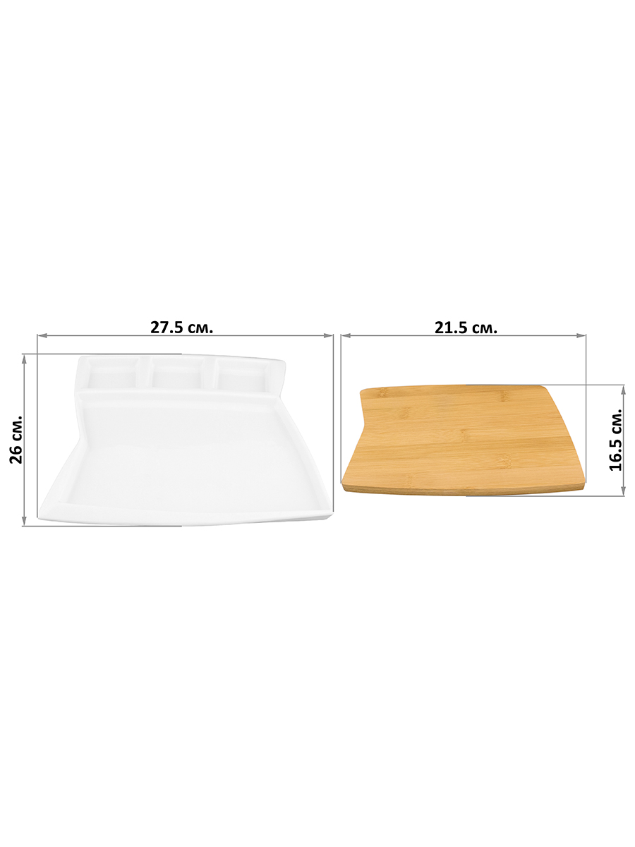 Набор для сервировки сыра из серии «Айсберг» предназначен для эстетичной подачи закусок к столу. Размер изделия – 27,5х26х1,7 см. Размер доски – 21,5х16,5х1 см. Выполнено из высококачественного белого фарфора, разделочная доска в комплекте выполнена из бамбука. Фарфор не впитывает цвет продуктов и легко отмывается, благодаря чему надолго сохранит свою белизну. Три отдела послужат в качестве секций менажницы или соусников. Разложите оливки, маслины, виноградины, фруктовые дольки или нарезанные овощи. Заполните кетчупом, майонезом или жидкими соусами. Разделочная доска позволит нарезать продукты без дополнительных кухонных принадлежностей. Сервировочное блюдо поможет вам создать идеальную атмосферу для приёма гостей или романтичного ужина дома. Возьмите его на дачу или пикник, чтобы красиво подавать любимые угощения. Используйте деревянную подставку для сервировки отдельно от блюда, чтобы подать ещё больше лакомств! Не рекомендуется применять абразивные моющие средства. Без бамбуковой подставки подходит для использования в микроволновой печи и посудомоечной машине. Бамбук нельзя замачивать! Фарфоровая сервировочная посуда с элементами из дерева станет оригинальным подарком для хозяйки, ценящей не только практичность, но и привлекательность. Серия «Айсберг» станет украшением любого кухонного инвентаря и позволит собрать красивый сервиз в едином стиле!