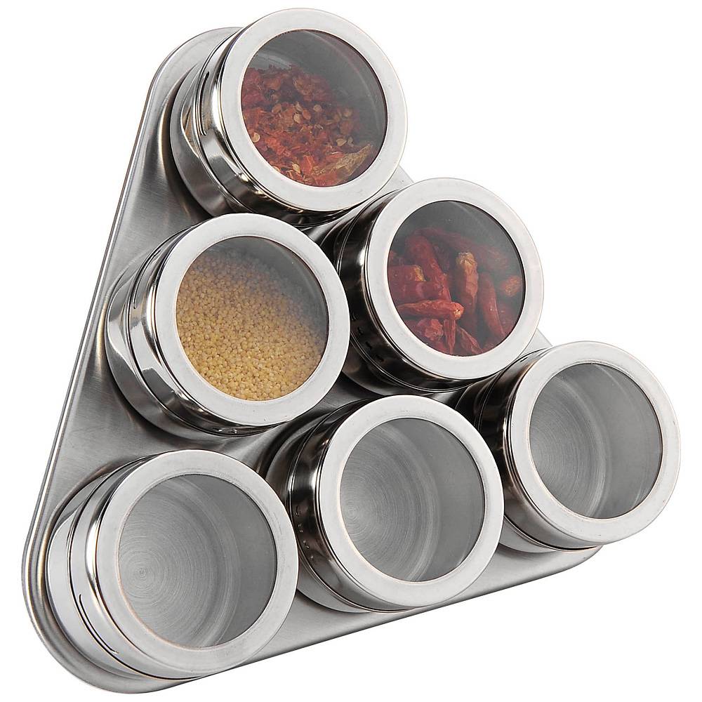 Каждая емкость для специй оснащена магнитом, вмонированным в дно, что позволяет при необходимости закрепить ее на любой другой металлической поверхности, например, дверце холодильника или металлической вытяжке над плитой.