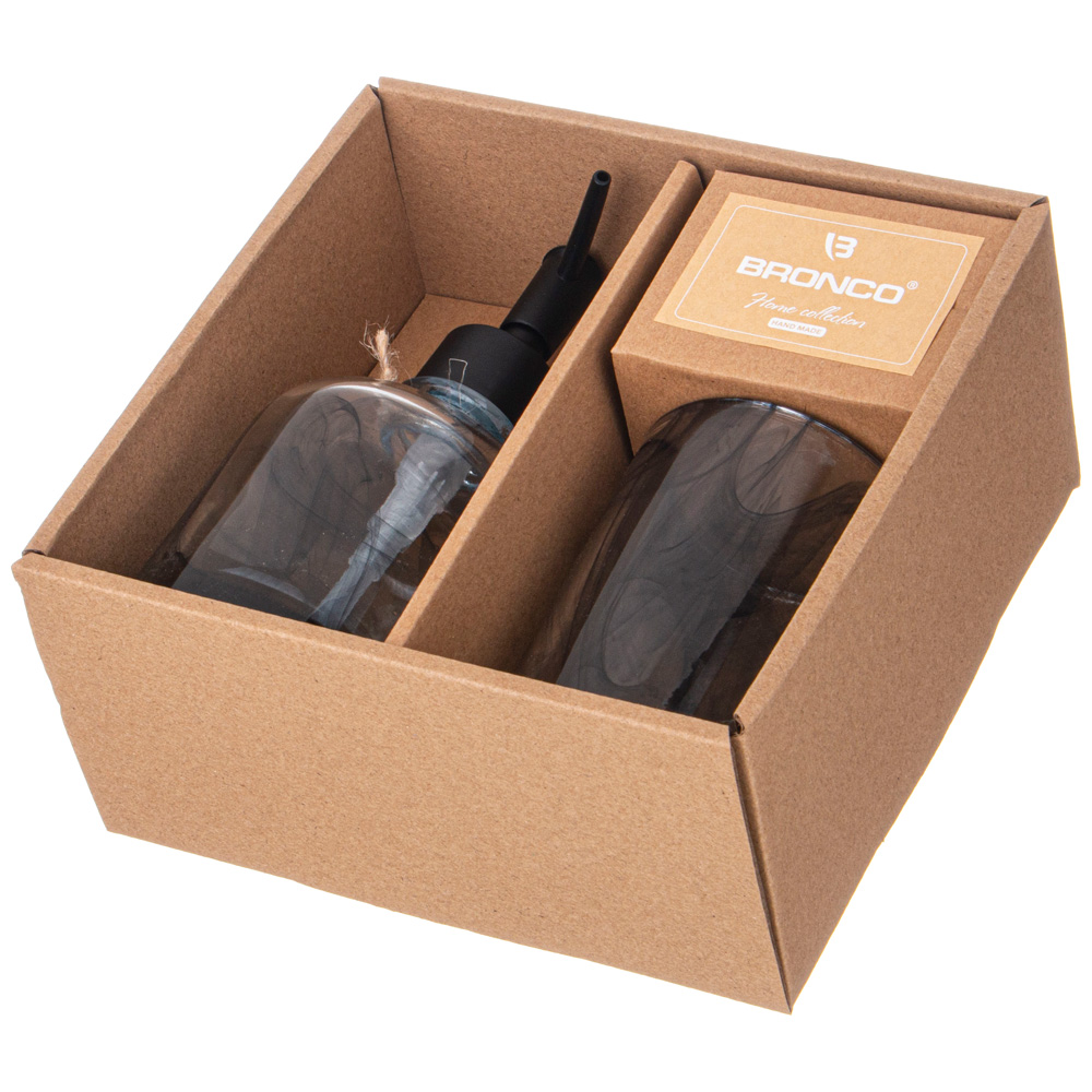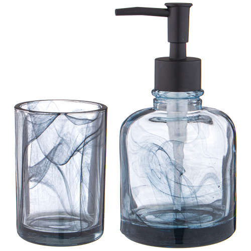 Набор аксессуаров для ванной комнаты состоит из дозатора для жидкого мыла и подставки-стакана.