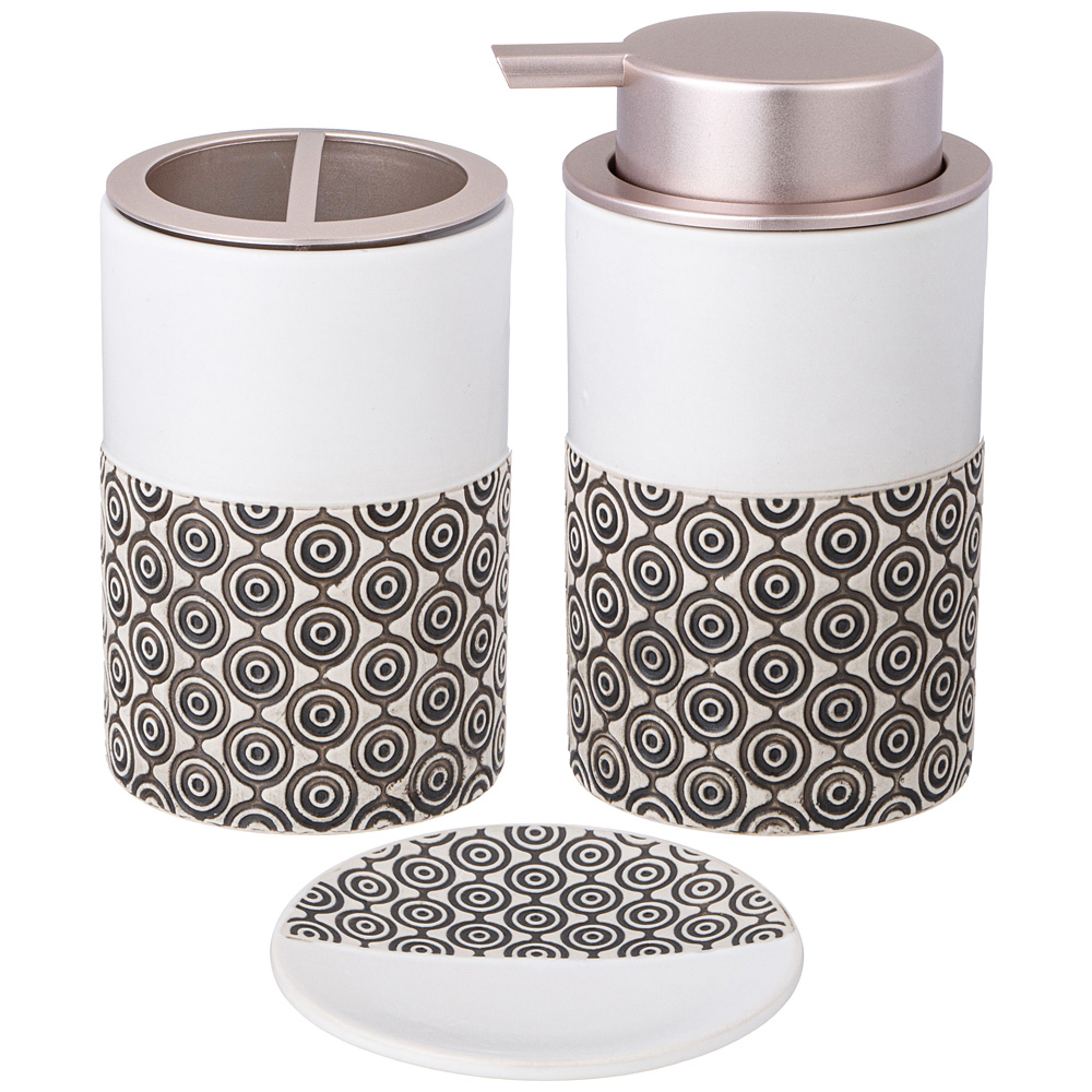 Секрет удачного оформления любого интерьера — яркие аксессуары! Дозатор для ванной не только внесёт изюминку в интерьер, но и придаст ему стильность, уют и ощущение завершенности. В комплект входит дозатор для жидкого моющего средства, мыльница и стакан для зубных щеток.