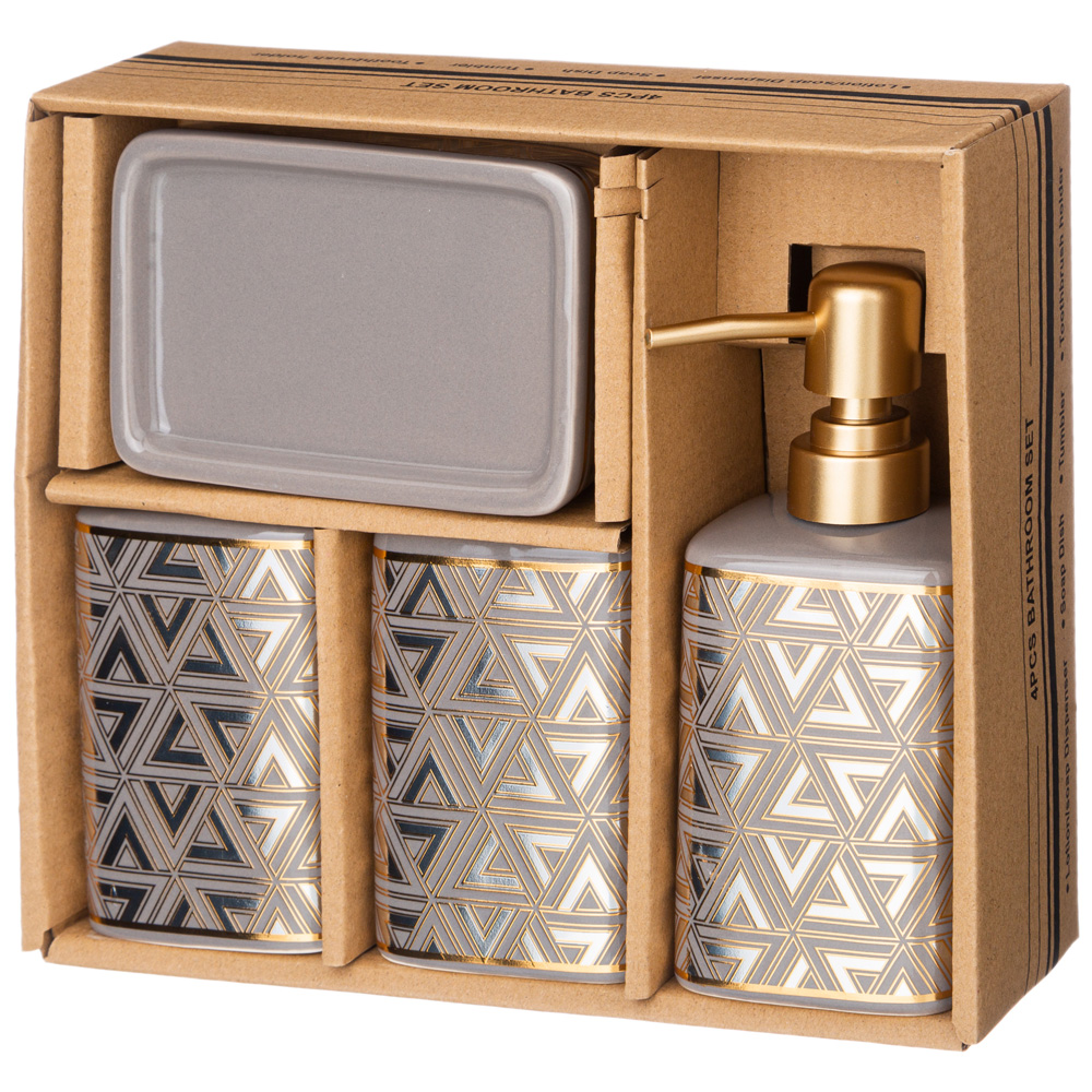 Набор аксессуаров для ванной комнаты состоит из дозатора для жидкого мыла, подставки-стакана, подставки для зубных щёток и мыльницы для кускового мыла.