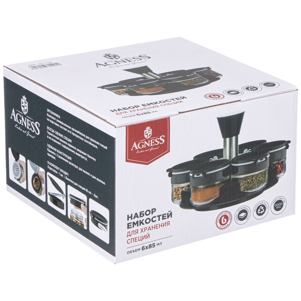 НАБОР ЕМКОСТЕЙ ДЛЯ СПЕЦИЙ 6ШТ 85МЛ НА ПОДСТАВКЕ AGNESS -включает в себя стеклянные емкости, предназначенные специально для удобного и долговременного хранения специй на кухне , и стильную подставку. Этот набор является не только полезным, но и стильным дополнением кухонного интерьера. Все баночки для специй выполнены из стекла – прочного и надежного материала для хранения пищевых продуктов. Они герметично закрываются, предотвращая попадание влаги и посторонних запахов. Это отличное решение для организации кухонного хранения и подарок для тех, кто любит готовить и экспериментировать с различными вкусовыми сочетаниями.
