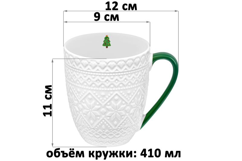 Набор 2 кружек «Праздничный орнамент» от Elan Gallery предназначен для эстетичной сервировки вашего стола. Размер каждой ёмкости – 12х9х11 см, объём – 410 мл. Выполнены из высококачественного белого фарфора. Он не впитывает цвет напитков и легко отмывается, благодаря чему надолго сохранит свою белизну. Поверхность изделий покрыта рельефным орнаментом, ручки окрашены в зелёный и красный цвета. На внутреннюю сторону нанесены маленькие рисунки ёлочки и подарков. Мы создали коллекцию новогодних и рождественских товаров для сервировки и декора, которые наполнят пространство атмосферой уюта. Изделия помогут оформить интерьер праздничными композициями и добавят нотку зимнего волшебства. Кофейные кружки помогут вам провести множество приятных завтраков с капучино и латте, а также уютные чайные вечера с конфетами, вафлями и другими сладостями. Подойдут ценителям чая и кофе, которые любят пить из красивой и необычной посуды. Согрейтесь зимой любимым напитком: какао с маршмэллоу, ягодным чаем, горячим шоколадом или глинтвейном. Летом освежитесь домашним лимонадом или морсом. Это эффектный подарок на любой праздник, в том числе на Новый год и Рождество. Не рекомендуется применять абразивные моющие средства. Подходят для использования в посудомоечной машине и микроволновой печи. Поставляются в дизайнерской картонной коробке – благодаря ей вам не потребуется дополнительная подарочная упаковка. В коллекции бренда Elan Gallery представлены посуда, сувениры и украшения с новогодней символикой. Каждый подберёт оригинальный сюрприз для семьи, друзей и коллег на Новый год и Рождество. Такой подарок наполнит дом семейным теплом и духом праздника!