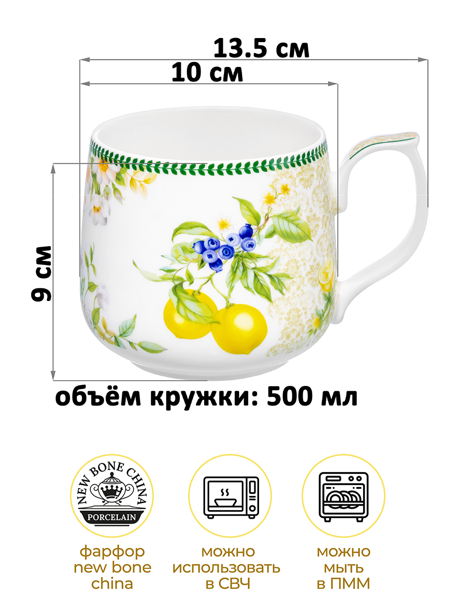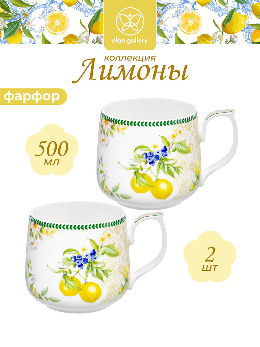 Набор 2 кружек из серии «Лимоны» от Elan Gallery предназначен для эстетичной сервировки вашего стола. Размер каждой ёмкости – 13,5х10х9 см, объём – 500 мл. Выполнены из фарфора нового поколения new bone china, сочетающего в себе изящность и высокую прочность. За счёт гладкости изделия легко отмываются, поэтому сохраняют привлекательный внешний вид и практичны в использовании. Плотная структура материала позволяет посуде дольше сохранять температуру блюд и напитков. От других видов костяного фарфора new bone china отличается большей экологичностью в производстве. Серия украшена ярким рисунком лимонов. Кофейные кружки помогут вам провести множество приятных завтраков с капучино и латте, а также уютные чайные вечера с конфетами, вафлями, другими десертами и сладостями. Подойдут ценителям чая и кофе, которые любят пить из красивой и необычной посуды. Согрейтесь зимой любимым напитком: какао с маршмэллоу, ягодным чаем или горячим шоколадом. Летом освежитесь домашним лимонадом или морсом. Не рекомендуется применять абразивные моющие средства. Подходят для использования в посудомоечной машине и микроволновой печи. Поставляются в дизайнерской картонной коробке – благодаря ей вам не потребуется дополнительная подарочная упаковка. Фарфоровая сервировочная посуда будет оригинальным подарком для хозяйки, ценящей не только практичность, но и привлекательность. Серия «Лимоны» от бренда Элан Галерея станет украшением любого кухонного инвентаря и позволит собрать красивый сервиз в едином стиле!