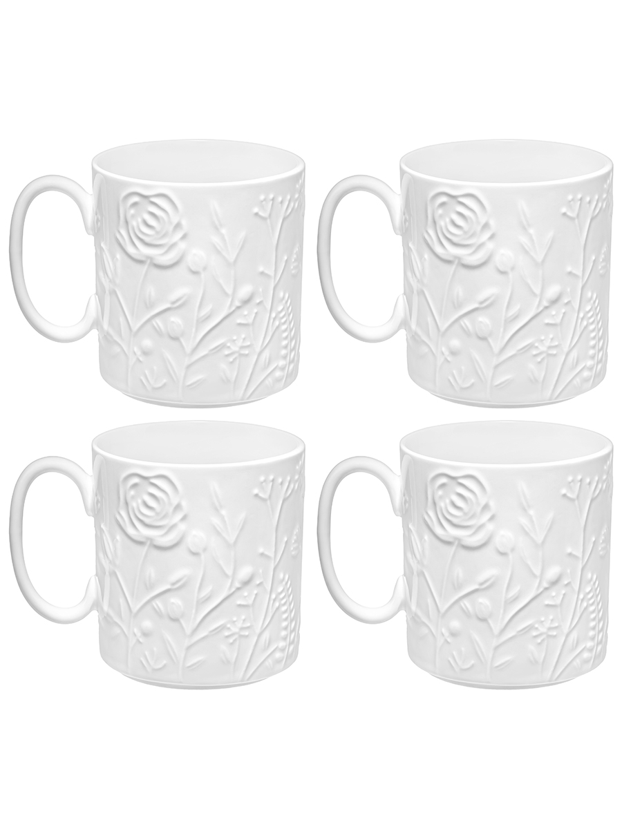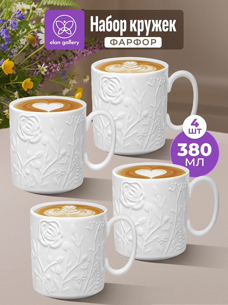 Набор 4 кружек из серии «Полевые цветы» от Elan Gallery предназначен для эстетичной сервировки вашего стола. Размер каждой ёмкости – 12x8,5x9,5 см, объём – 380 мл. Выполнены из высококачественного белого фарфора. Он не впитывает цвет напитков и легко отмывается, благодаря чему надолго сохраняет свою белизну. Поверхность изделий украшает рельефный узор в виде тонких полевых цветов. Кофейные кружки помогут вам провести множество приятных завтраков с капучино и латте, а также уютные чайные вечера с конфетами, вафлями, другими десертами и сладостями. Подойдут ценителям чая и кофе, которые любят пить из красивой и необычной посуды. Согрейтесь зимой любимым напитком: какао с маршмэллоу, ягодным чаем или горячим шоколадом. Летом освежитесь домашним лимонадом или морсом. Не рекомендуется применять абразивные моющие средства. Подходят для использования в посудомоечной машине и микроволновой печи. Поставляются в дизайнерской картонной коробке – благодаря ей вам не потребуется дополнительная подарочная упаковка. Фарфоровая сервировочная посуда от бренда Элан Галерея станет оригинальным подарком для хозяйки, ценящей не только практичность, но и привлекательность. Она станет украшением любого кухонного инвентаря и позволит собрать красивый сервиз в едином стиле!