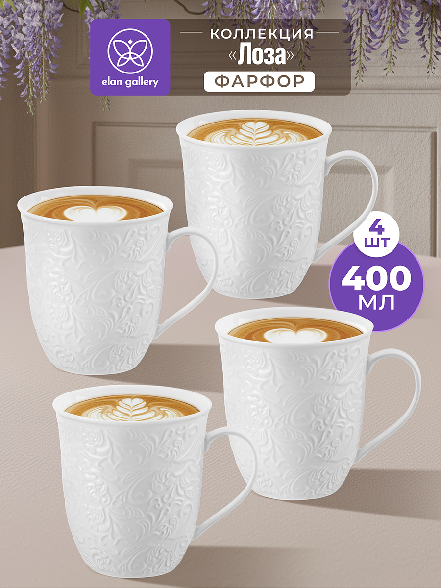 Набор 4 кружек из серии «Лоза» от Elan Gallery предназначен для эстетичной сервировки вашего стола. Размер каждой ёмкости – 12,5х9,5х10 см, диаметр дна – 5,5 см, объём – 400 мл. Выполнены из высококачественного белого фарфора. Он не впитывает цвет напитков и легко отмывается, благодаря чему надолго сохраняет свою белизну. Поверхность изделий украшена рельефным узором в виде тонкой и элегантной лиственной лозы. Кофейные кружки помогут вам провести множество приятных завтраков с капучино и латте, а также уютные чайные вечера с конфетами, вафлями, другими десертами и сладостями. Подойдут ценителям чая и кофе, которые любят пить из красивой и необычной посуды. Согрейтесь зимой любимым напитком: какао с маршмэллоу, ягодным чаем или горячим шоколадом. Летом освежитесь лимонадом или морсом. Не рекомендуется применять абразивные моющие средства. Подходят для использования в посудомоечной машине и микроволновой печи. Поставляются в дизайнерской картонной коробке – благодаря ей вам не потребуется дополнительная подарочная упаковка. Фарфоровая сервировочная посуда станет оригинальным подарком для хозяйки, ценящей не только практичность, но и привлекательность. Серия «Лоза» от бренда Элан Галерея станет украшением любого кухонного инвентаря и позволит собрать красивый сервиз в едином стиле!