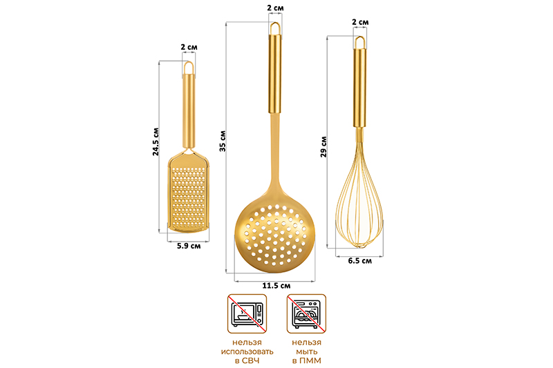 Набор 3 принадлежностей от Elan Gallery станет практичным дополнением вашего кухонного инвентаря. Включает в себя тёрку размером 24,5х5,9х2 см, венчик размером 29х6,5х6,5 см и шумовку размером 35х11,5х2 см. Выполнены из нержавеющей стали и имеют титановое покрытие. Оно не только придаёт им благородный золотистый цвет, но и повышает износостойкость и термостойкость, а также защищает от коррозии. Благодаря лаконичному дизайну приборы гармонично дополнят интерьер любого дома. Покрытие безопасно для контакта с пищевыми продуктами. Приспособления предназначены для самых разнообразных кулинарных целей. Маленькая тёрка поможет вам измельчить лук или чеснок, чтобы заправить салаты и готовые блюда по своему вкусу. С венчиком удобно замешивать тесто для приготовления любимой выпечки и кондитерских изделий. С помощью шумовки у вас всегда будут получаться чистые и вкусные бульоны. Ситечко поможет вам отварить картофель и овощи, а благодаря своему размеру подойдёт для большинства стандартных кастрюль. Крупные отверстия предотвращают скопление лишней жидкости. Петли на ручках позволят компактно хранить приборы на кухне – повесьте их на рейлинг или любой свободный крючок. Не рекомендуется применять абразивные моющие средства. Не подходят для использования в посудомоечной машине и микроволновой печи. Поставляются в дизайнерской блистерной упаковке, которая может послужить в качестве подарочной. Комплект универсальных аксессуаров от бренда Элан Галерея станет прекрасным подарком для хозяйки, ценящей не только практичность, но и привлекательность изделий.