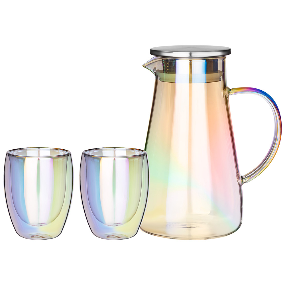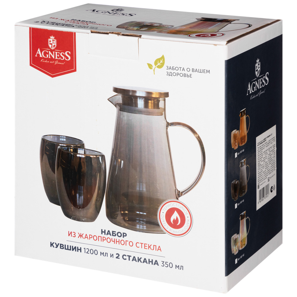 Данный набор выполнен из термостойкого жаропрочного стекла, которое выдерживает высокую температуру кипящей воды. В него входят кувшин и 2 стакана.