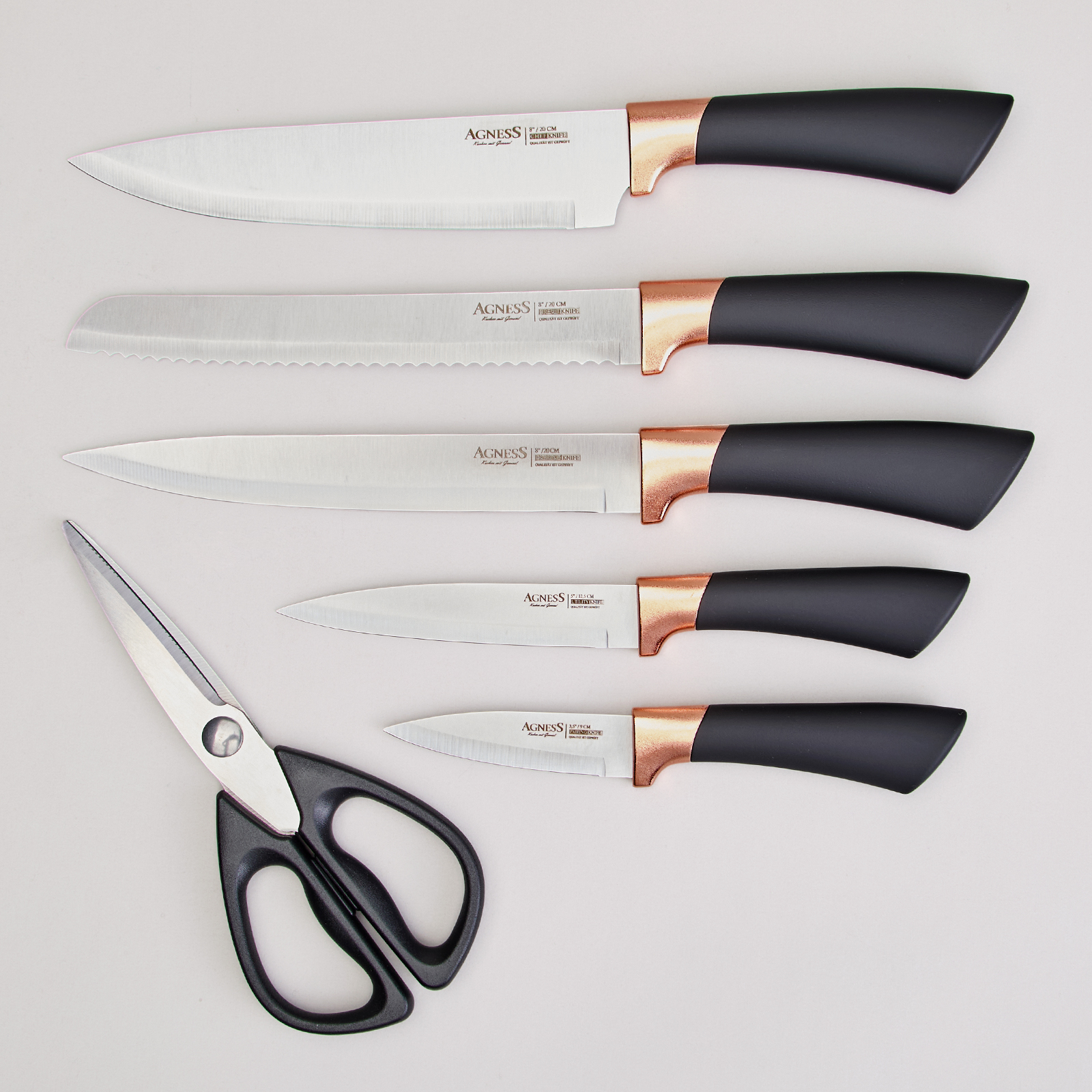 ● Состав набора: Нож поварской 20см, Нож для нарезки 20см, Нож для хлеба 20см, Нож универсальный 12,5см, Нож для чистки овощей и фруктов 9см, Ножницы для птицы.