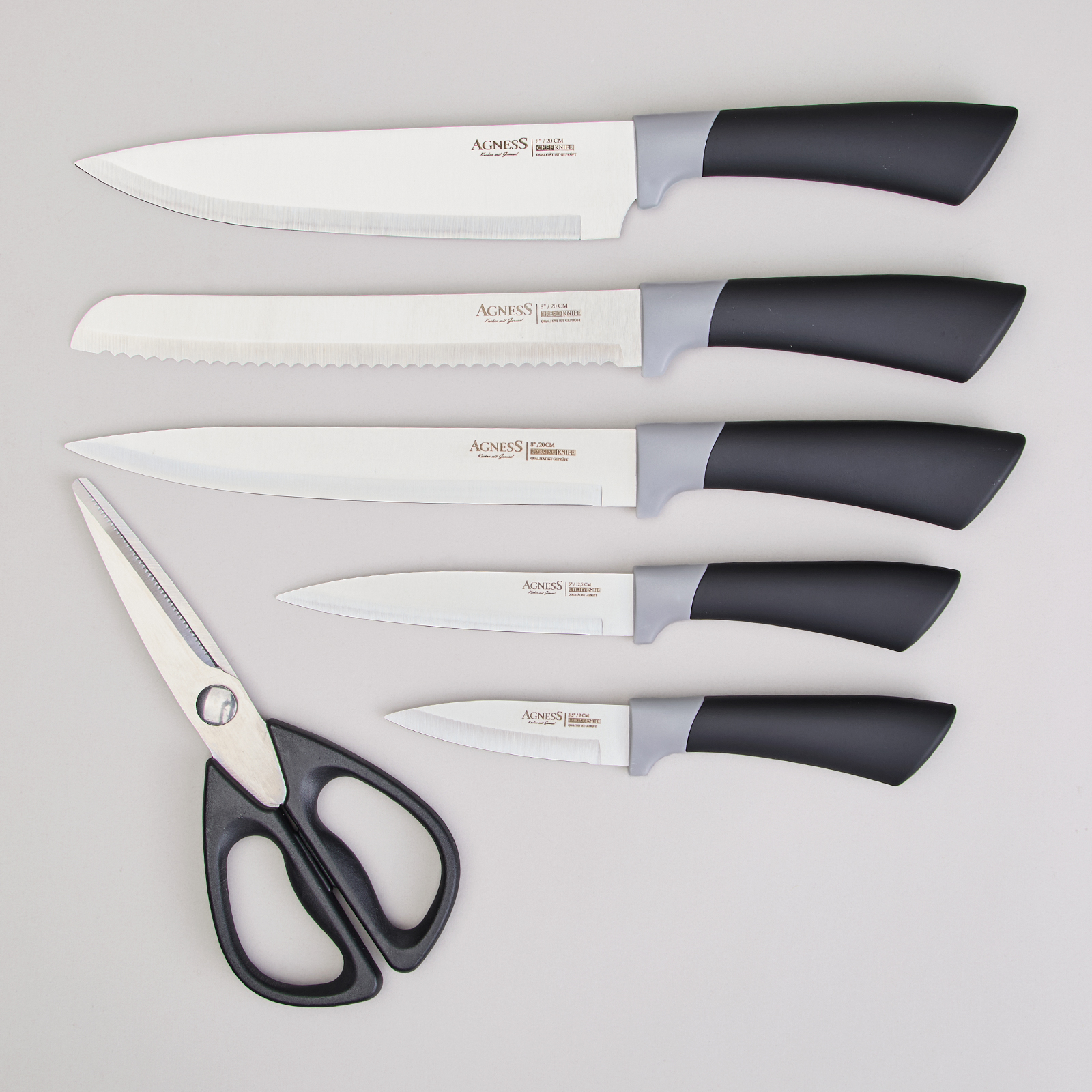 ● Состав набора: Нож поварской 20см, Нож для нарезки 20см, Нож для хлеба 20см, Нож универсальный 12,5см, Нож для чистки овощей и фруктов 9см, Ножницы для птицы.