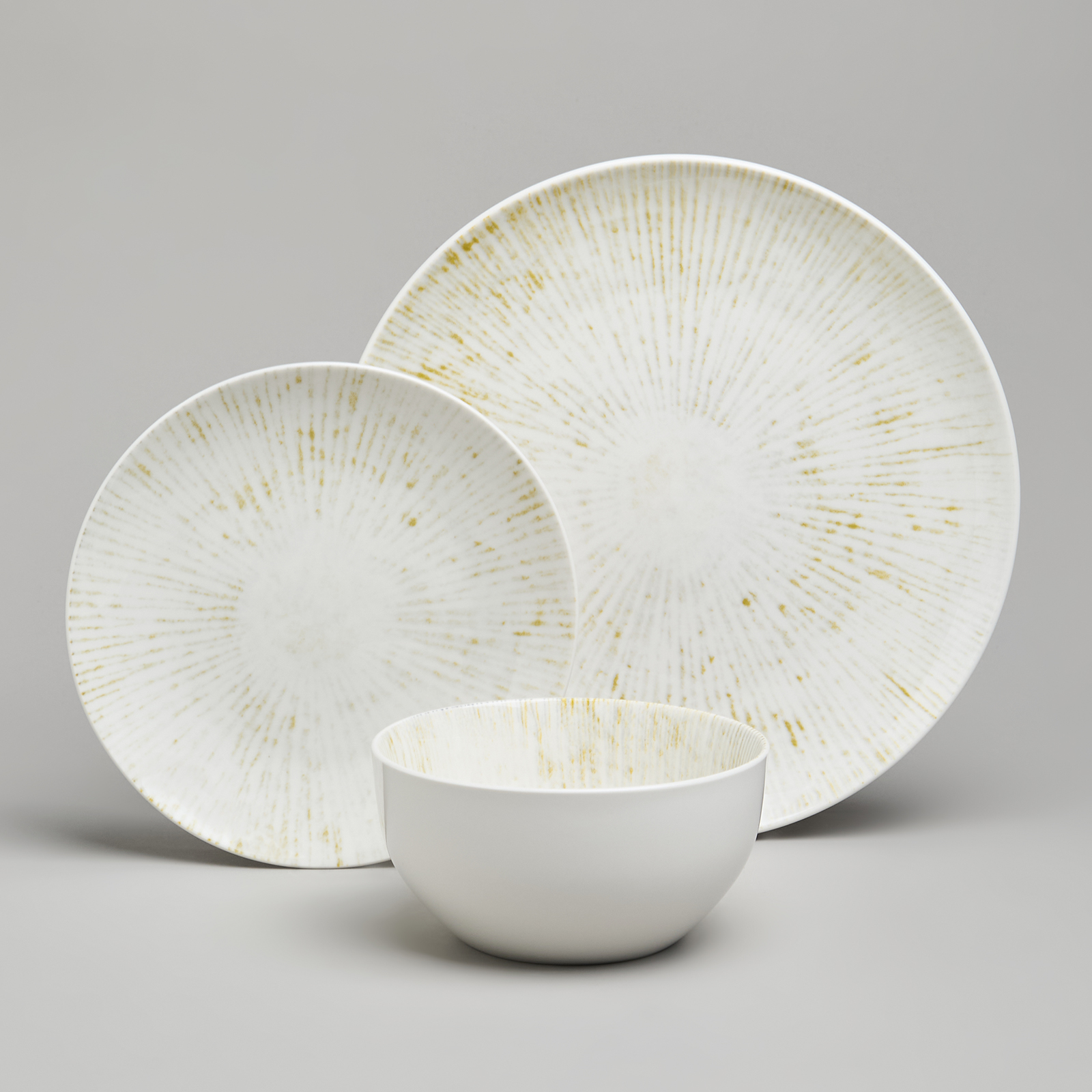 Горчичный — теплый и насыщенный оттенок, который добавляет яркости и уюта в интерьер. Удобные формы, размеры и элегантный дизайн, создающий эффект солнечных лучей, добавят яркие акценты в повседневную трапезу. Прекрасный подарок! Посуда выполнена из высококачественного фарфора, прошла сертификацию и безопасна для контакта с пищевыми продуктами. Можно смело использовать в микроволновой печи и мыть в посудомоечной машине.