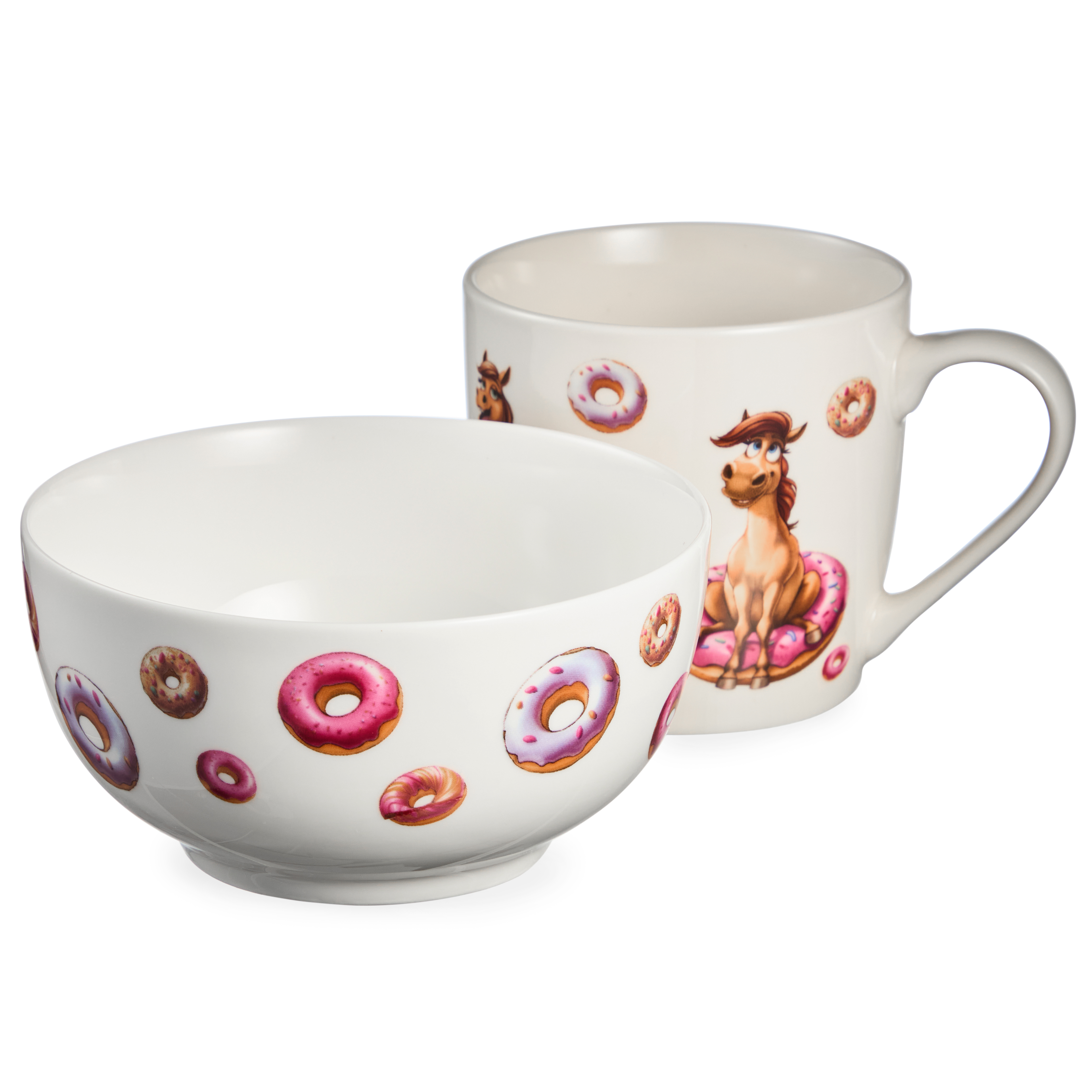 Набор посуды TM Lefard "PONYCAKE" — это сочетание вкуса, стиля и вдохновения для ценителей сладких радостей и любителей свободного духа. На каждом предмете — яркие пончики, символизирующие радость и удовольствие, и изящные пони, напоминающие о силе, свободе и движении вперёд. Набор включает кружку и салатник необходимые для повседневного использования.