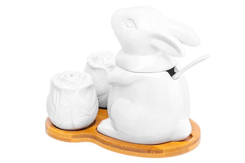Набор - сахарница 200 мл 15,5*11,5*13 см "Заяц с капустой" с ложкой + солонка+перечница на дер.подст