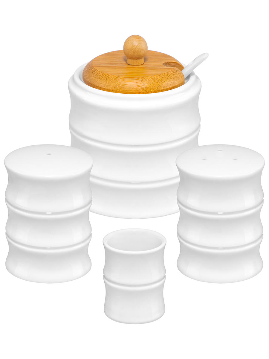 Набор посуды на деревянной подставке из серии «Бамбук» от Elan Gallery предназначен для эстетичной сервировки вашего стола. Включает в себя сахарницу с ложкой, вазочку под зубочистки и набор для специй. Выполнены из высококачественного белого фарфора. Он не впитывает цвет продуктов и легко отмывается, благодаря чему надолго сохраняет свою белизну. Поверхность изделий украшает рельеф, имитирующий бамбуковые стебли. Подставка и крышка сахарницы выполнены из натурального бамбука. Размер подставки – 22х14х16 см. По центру оснащена ручкой. Размер сахарницы – 8,5х8,5х11 см, объём – 320 мл. Подойдёт для хранения не только сахара, но и соли, специй и приправ. Засыпьте внутрь чай или кофе, чтобы в любой момент заварить свежий напиток. Подайте вместе с горячими блюдами, чтобы приправить пищу по своему вкусу. Приспособьте ёмкость под варенье, мёд или икру. Маленькая ложечка позволит удобно набрать необходимое количество продуктов и компактно помещается в баночке благодаря выемке на крышке. Такое изделие отлично дополнит сервировку стола как для сытного завтрака, так и для уютного чаепития. Набор для специй позволит держать под рукой необходимые приправы. Размер каждой ёмкости – 5х5х7 см, объём – 75 мл. Наполняются через отверстие снизу и закрываются пластиковой пробкой. Размер вазочки для зубочисток – 4х4х5 см, объём – 35 мл. Она станет удобной гигиенической принадлежностью. Зубочистки не входят в комплект. Не рекомендуется применять абразивные моющие средства. Без бамбуковых и пластиковых элементов ёмкости подходят для использования в микроволновой печи и посудомоечной машине. Бамбук нельзя замачивать! Набор поставляется в дизайнерской картонной коробке – благодаря ей вам не потребуется дополнительная подарочная упаковка. Фарфоровая сервировочная посуда будет оригинальным подарком для хозяйки, ценящей практичность и привлекательность. Серия «Бамбук» от бренда Элан Галерея станет украшением любого кухонного инвентаря и позволит собрать красивый сервиз в едином стиле!