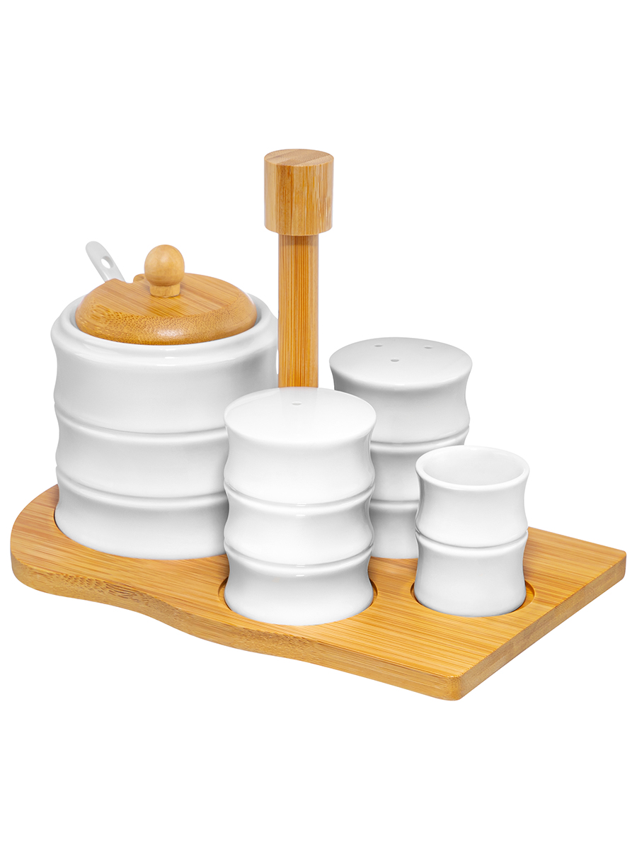 Набор-сахарница 320 мл "Бамбук" с ложкой+солонка+перечница+ваз. п/зубочистки на дер. подст. с ручкой