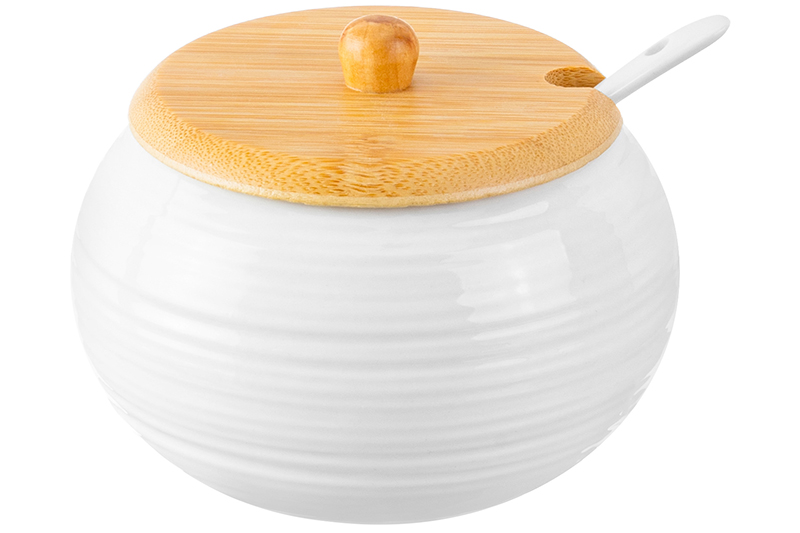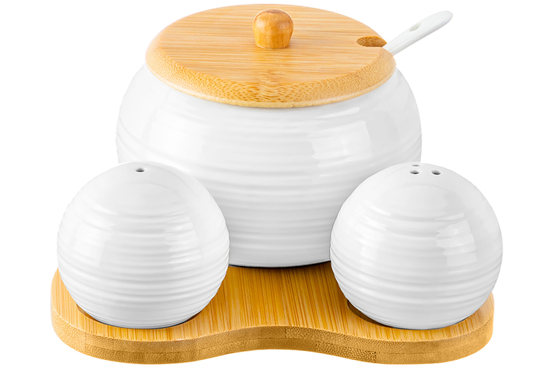 Набор Elan Gallery серии "Шёлк" состоит из сахарницы объёмом 400 мл, солонки и перечницы на бамбуковой подставке. Размер набора - 15х15,5х9 см. Сахарница 11х11х8,5 см имеет крышку из бамбука (высота изделия без крышки – 6,5 см) и фарфоровую ложку в комплекте. Баночка с ложечкой подойдёт не только для хранения сахара, но и мёда, варенья или джема. Размер солонки и перечницы: 6х6х5 см каждая баночка (объём по 70 мл). Набор выполнен из белого фарфора и натурального бамбука. Сахарница и ёмкости для специй имеют рельефный узор в виде полосочек и станут украшением вашего стола как в будни, так и на праздник. Баночки для специй круглой формы внизу имеют отверстия для наполнения, которые закрываются пробками. В них можно насыпать соль, перец или любые приправы. Фарфоровые детали без бамбуковых крышки и подставки можно использовать в микроволновой печи и посудомоечной машине. Изделия из бамбука нельзя замачивать! Столовый набор поставляется в стильной картонной упаковке. Сахарница и набор для специй из серии посуды "Шёлк" станет настоящим украшением любой кухни или приятным подарком для ваших близких!