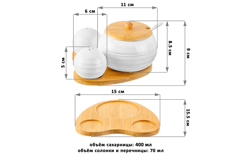 Набор - сахарница 400 мл 15*15,5*9 см "Шелк" с ложкой + солонка+ перечница дер.под.